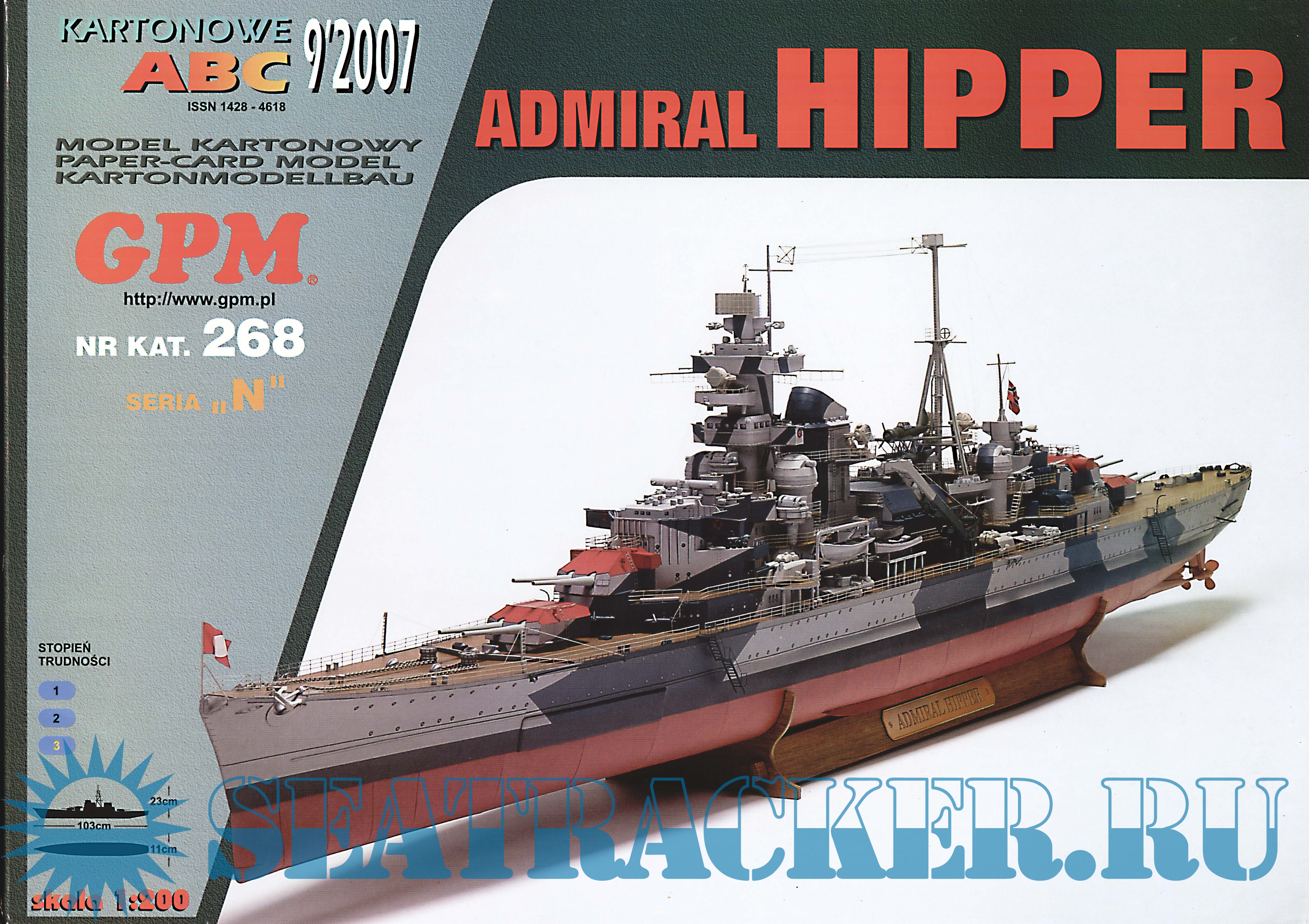 45 листов цветных выкроек и инструкций для изготовления бумажной модели немецкого тяжёлого крейсера Admiral Hipper в масштабе 1:200