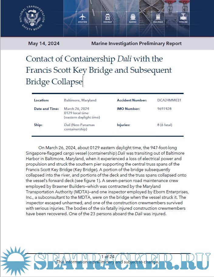 Year: 2024 Language: English Author: National Transportation Safety Board Genre: Other Format: PDF Quality: OCR without errors Pages count: 24 Description: Contact of Containership Dali with the Francis Scott Key Bridge and Subsequent Bridge Collapse