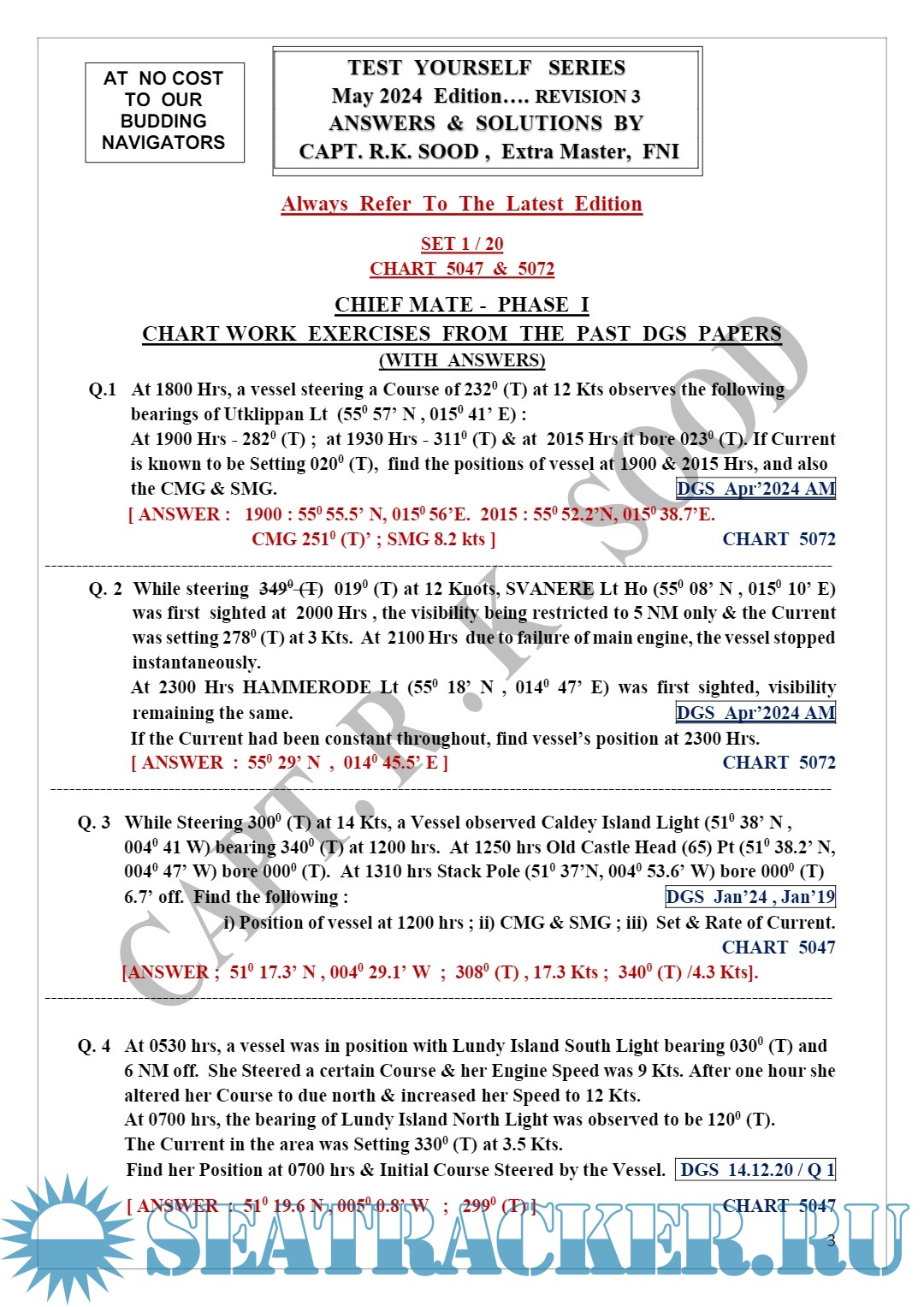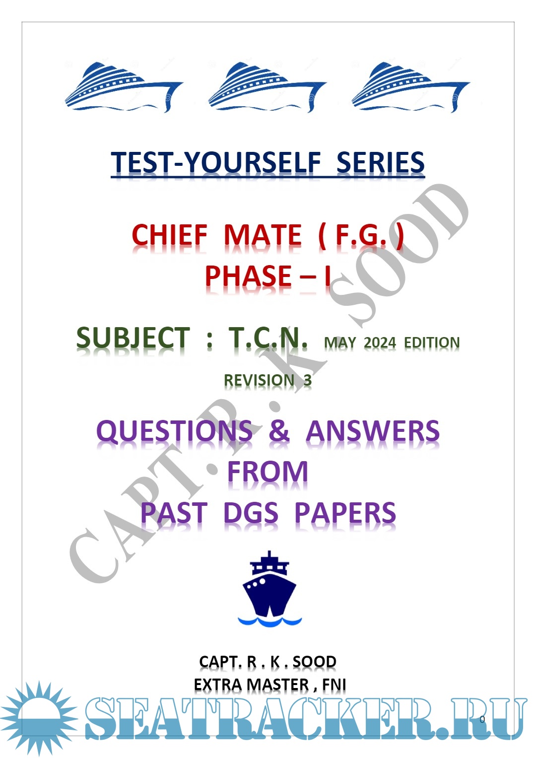 Year: 2024 Language: English Author: Capt. R.K. Sood Edition: Revision 3 | May Format: PDF Quality: eBook Pages count: 68 Description: From the author: As a starter, under ‘TEST YOURSELF SERIES’ , I have tried to venture in to the field of ‘TERRESTRIAL & CELESTIAL NAVIGATION’ (TCN) Subject of Chief Mate (F.G.) Level, notoriously considered by some to be the ‘Most Difficult Paper to Crack’ among all Subjects from Master (F.G.) down to Second Mate (F.G.) levels ! Variety of Questions, covering virtually all topics of the Subject, which have appeared in the Past DGS Examinations Papers and some my own, have been solved and ANSWERS given, so that you can check your own Competence in the subject of NAVIGATION. Please disregard the previous three editions of the same Series. A Word-of-Caution : Since I have solved CHARTWORK Questions on the Original Charts, your own Answers may differ somewhat from my own, particularly if you solve these Questions on the Photostatted Copies of Charts ! In spite of Corrections/Amendments made through three previous editions, should you still find any errors in my answers, kindly let me know. I will surely make changes after re-checking of the same. Wishing you all success in your Competency Examinations & have Safe Sailings. Additional info: About the Author: This small ‘Effort’ of mine, for the benefit of Mariners & at NO-COST to them, is dedicated to my Guruji Capt. S.S.S. Rewari, an epitome of Maritime Education & Training in India, and under whose Guidance & Encouragement, I reached this humble level of teaching the intricacies of CELESTIAL, Terrestrial & Oceanic NAVIGATION Subject, to our budding Navigators in the Merchant Navy. I have been teaching these & other Subjects to Marine Officers, in D.G.S. Approved Post-Sea Maritime Training Institutes, for the past 30 years, from the levels of second-Mates up to MASTER (Foreign Going) & beyond levels, right up to Revalidation Courses, when Officers are preparing for their COMPETENCY Examinations held by the Directorate General of Shipping, GOI and for Updating their Licenses. Earlier, I had sailed for 23 years (14 years as Master) on Foreign Going ships under the Management of ANGLO EASTERN , UNIVAN & WALLEM.