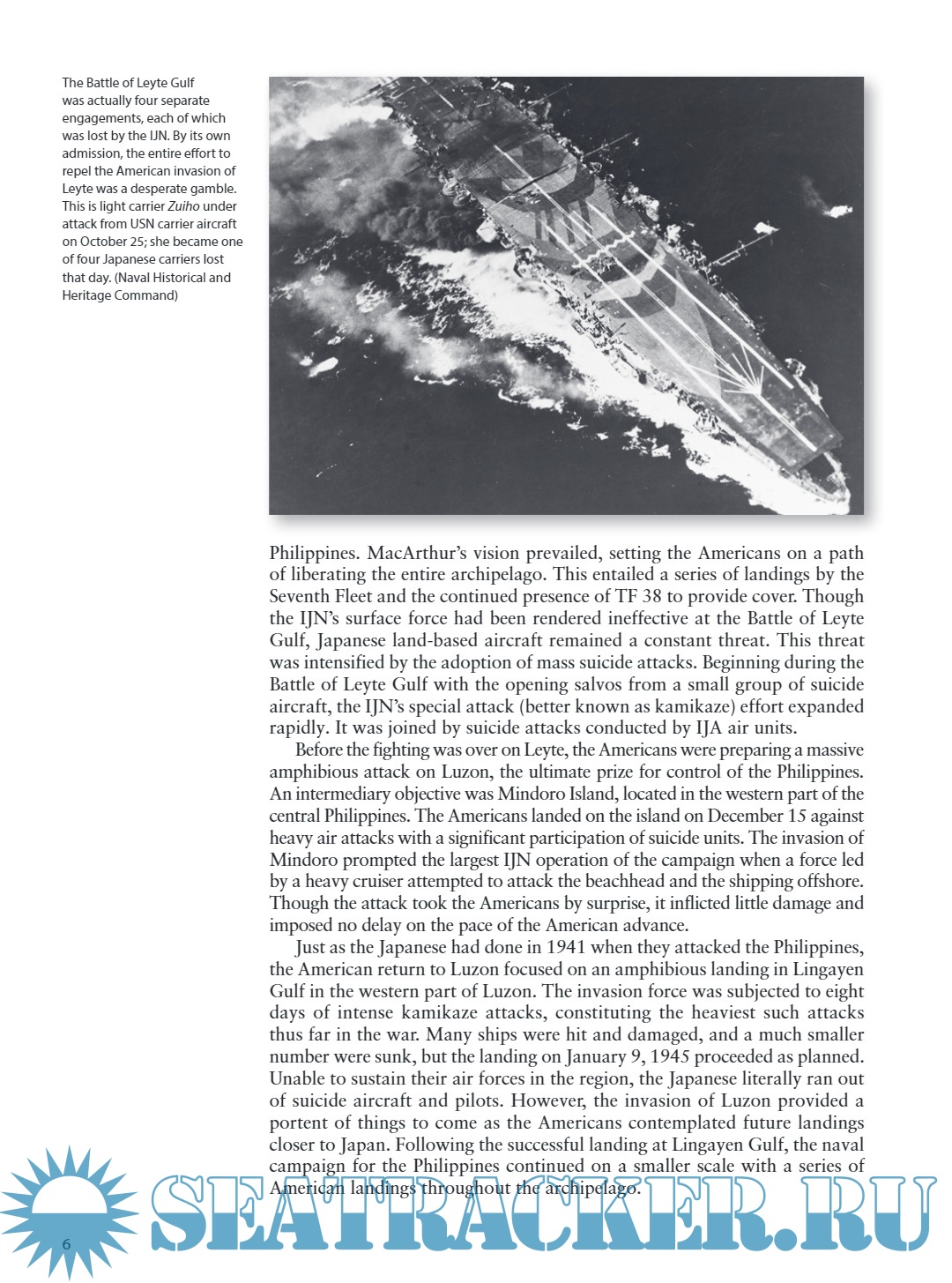The events that took place in the aftermath of the Battle of Leyte Gulf in October 1944 are often overlooked by military historians. An impressive array of naval operations continued in the Philippines up to January 1945, which included (on the Japanese side) the largest convoys to a contested island during the war, the first kamikaze campaign, and the second largest Imperial Japanese Navy surface operation during the last nine months of the conflict. On the American side, US forces were involved in efforts to cut off Leyte from enemy reinforcement, a massive amphibious invasion off Luzon, and large-scale operations by the Fast Carrier Task Force (TF 38).