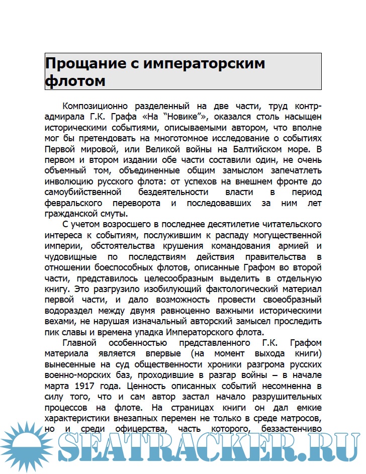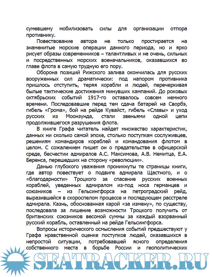 В предлагаемом издании читатель познакомится со второй и заключительной частью труда Г.К. Графа, озаглавленной автором «Смерть флота». В ней охватывается период от событий накануне революции 1917 года и до смерти адмирала Колчака. Автор подробно описывает царившую атмосферу и трагические события, происходившие на Балтийском флоте в 1917–1918 годах.