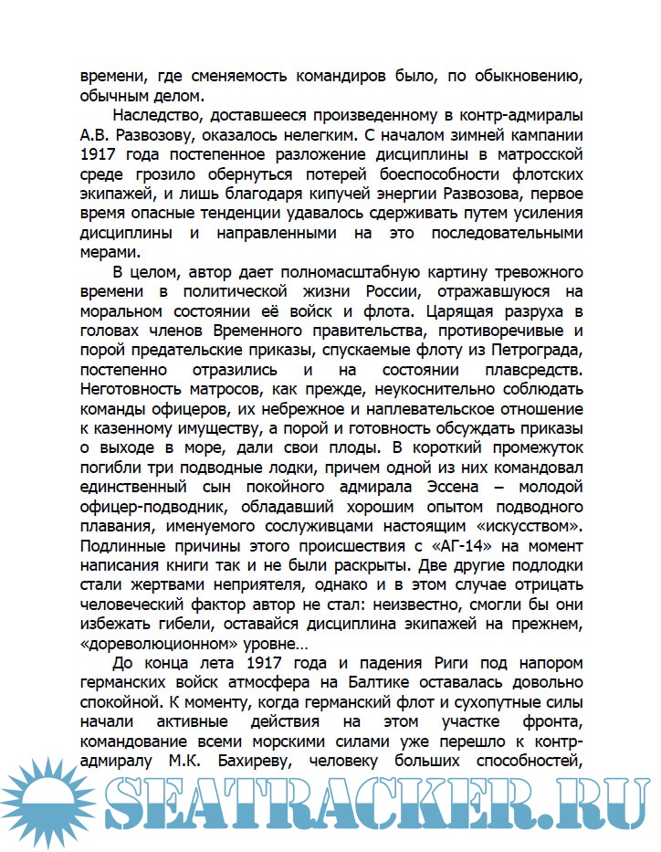 III Судовые комитеты. "Центробалт". Натравливание команд на офицеров. Снятие погон. Уничтожение званий кондукторов и сверхсрочнослужащих. Переименование кораблей. Образование союзов. Делегация офицеров у Керенского. Смещение Максимова и назначение контр-адмирала Д.Н. Вердеревского. Его конфликт с Временным правительством. Назначение А.В. Развозова. Корнилов-ское выступление. Убийство четырех офицеров "Петропавловска". Взгляд Керенского на это злодеяние. "Углублениереволюции" на флоте. Выборы в Учредительное собрание. Большевистский переворот. Гибель "Гепарда" и "Бдительного". "Морская коллегия". Модест Иванов. Упразднение должности командующего флотом. Уход Развозова, Бахирева, Беренса и других офицеров. Декрет о "красном флоте". Беспокойство команд в связи со слухами о германском десанте. Избрание вице-адмирала Развозова и его арест. Германская эскадра в Гангэ. Уничтожение "АГ-11", "АГ-12", "АГ-15", "АГ-16", "Оланда" и "Ястреба". Ультиматум об уходе из Гельсингфорса. Уничтожение английских подлодок. Переход флота в Кронштадт. Суд и казнь A.M. Щастного