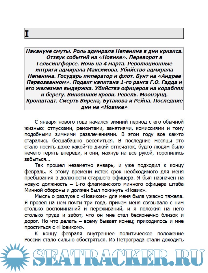 I Накануне смуты. Роль адмирала Непенина в дни кризиса. Отзвук событий на "Новике". Переворот в Гельсингфорсе. Ночь на 4 марта. Революционные интриги адмирала Максимова. Убийство адмирала Непенина. Государь император и флот. Бунт на "Андрее Первозванном". Подвиг капитана 1-го ранга Г.О. Гадда и его железная выдержка. Убийства офицеров на кораблях и берегу. Виновники крови. Ревель. Моонзунд. Кронштадт. Смерть Вирена, Бутакова и Рейна. Последние дни на "Новике"