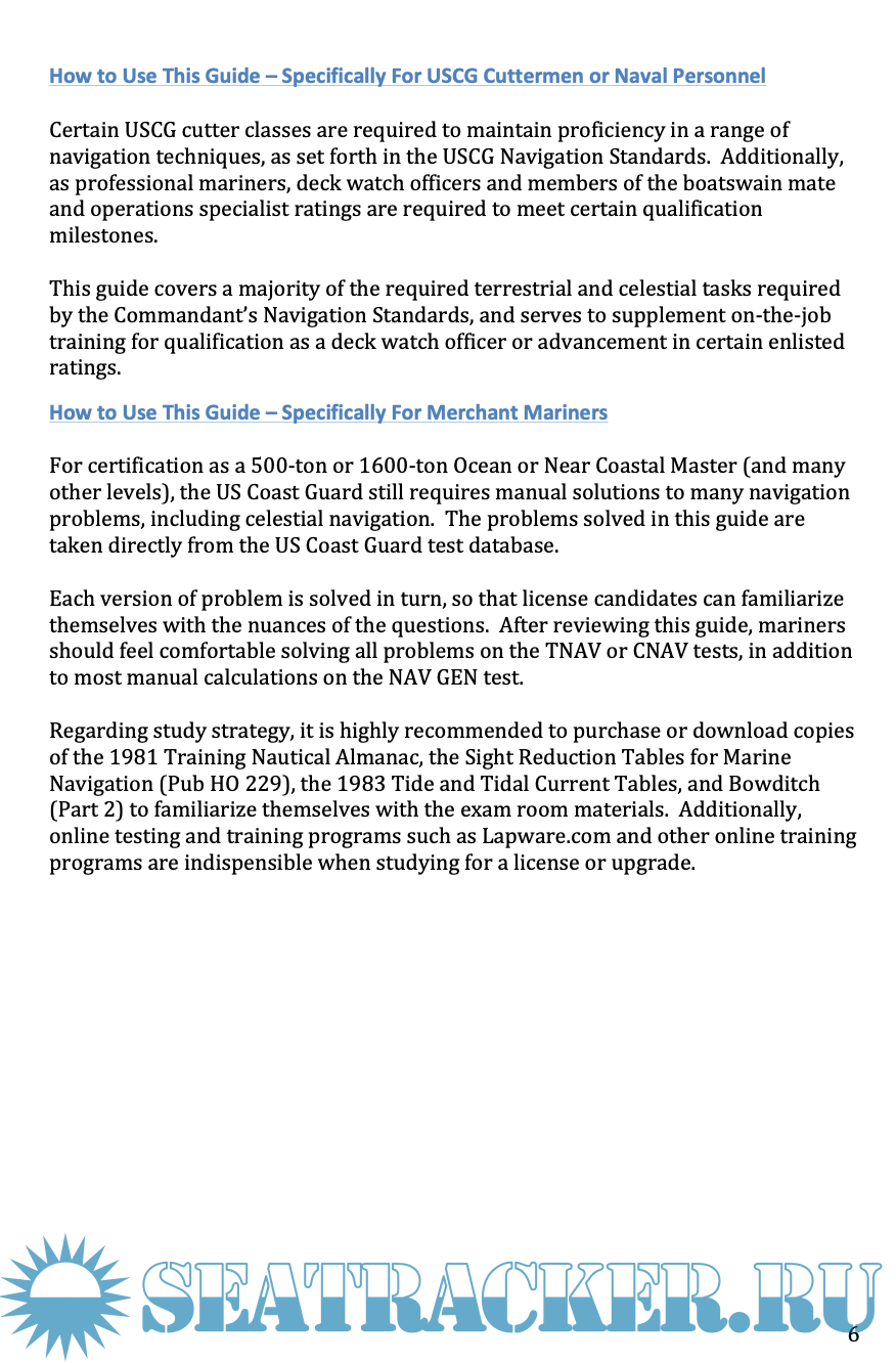 Year: 2016 Language: English Author: Christopher D. Nolan Genre: Textbook Edition: 2nd Format: PDF Quality: eBook Pages count: 320 Description: In the age of electronic navigation, older manual calculation methods have fallen out of favor. However esoteric it may seem, competent navigators must maintain proficiency with older navigation methods for three main reasons: The first reason is that higher authority mandates it. Service navigation standards and national licensing require proficiency in solving many types of navigation problems. The second reason is for potential electronic failure. Although rare, in the event of a GPS or other electronic signal disruption, older methods of position fixing are required. In an age where many watch officers seldom plot positions on paper charts; maintaining proficiency with manual navigation problems is crucial. The third reason for familiarity with navigation problem solving is for personal satisfaction. Ship’s navigators are part of a heritage that goes back thousands of years. We are lucky to live in an age where navigation can be so easy, but tradition requires us to devote our energies to mastering our craft.