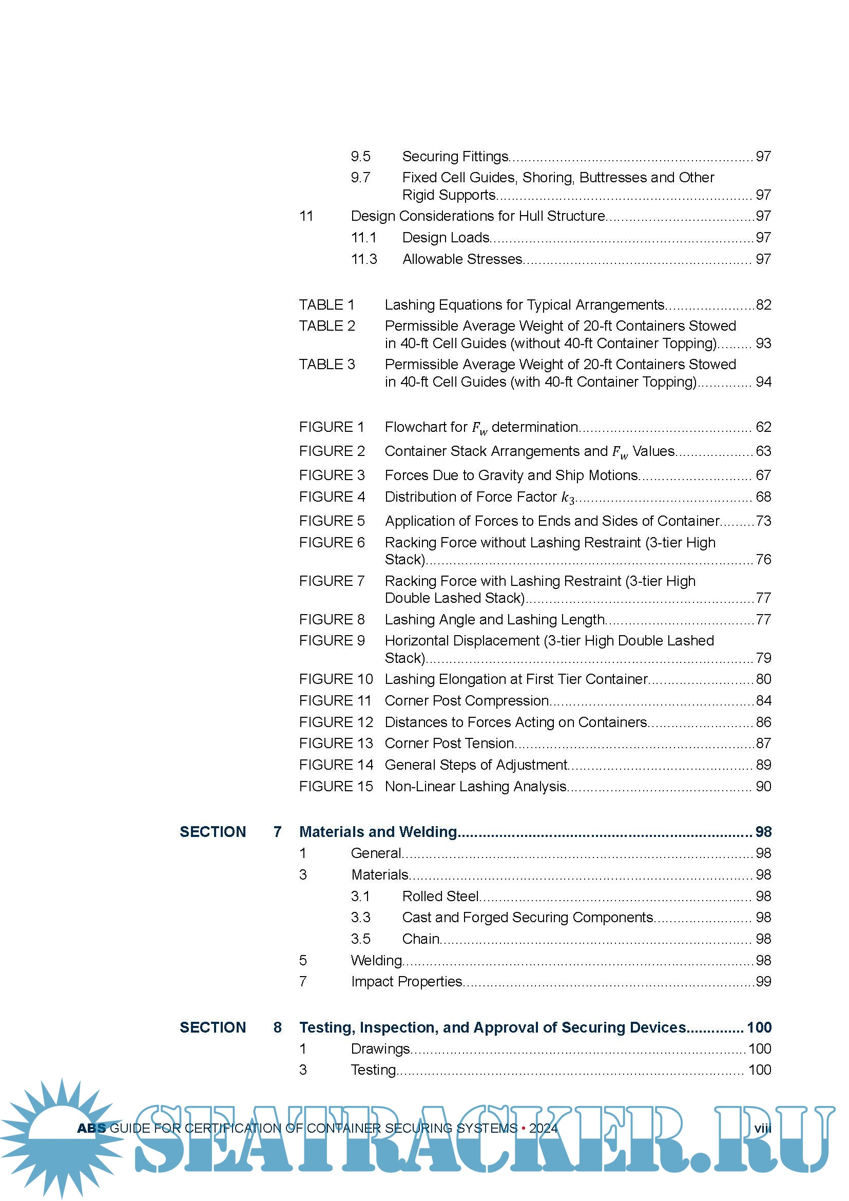 Year: 2024 Language: English Author: American Bureau of Shipping (ABS) Genre: Guide Edition: May 2024 Format: PDF Quality: eBook Pages count: 132 Description: The Guide for Certification of Container Securing Systems was first published by ABS with input andadvice from industry. When requested by the Owner, ABS will issue certificates for container securingsystems which have been constructed and installed according to the requirements of this Guide. However,such a certification is not a classification requirement. Existing container securing systems which have not been constructed and installed to the requirements ofthe Guide will, at the request of the Owner, be subjected to a condition survey and plan review forcompliance or equivalence with the Guide. The 2024 edition added a Reduction Factor for transverse acceleration of the vessel based on a Route Splitting approach. Subsection 2/1 was updated and 6/3.7.5 was added for the requirements of the CLP-V(PARR) notation. The 2024 edition removed the limitation in Subsection 6/5 that the nonlinear procedure is to be used only for external lashings. The May 2024 edition adds factors for large bilge keels and anti-rolling tanks in the calculation of roll motions.