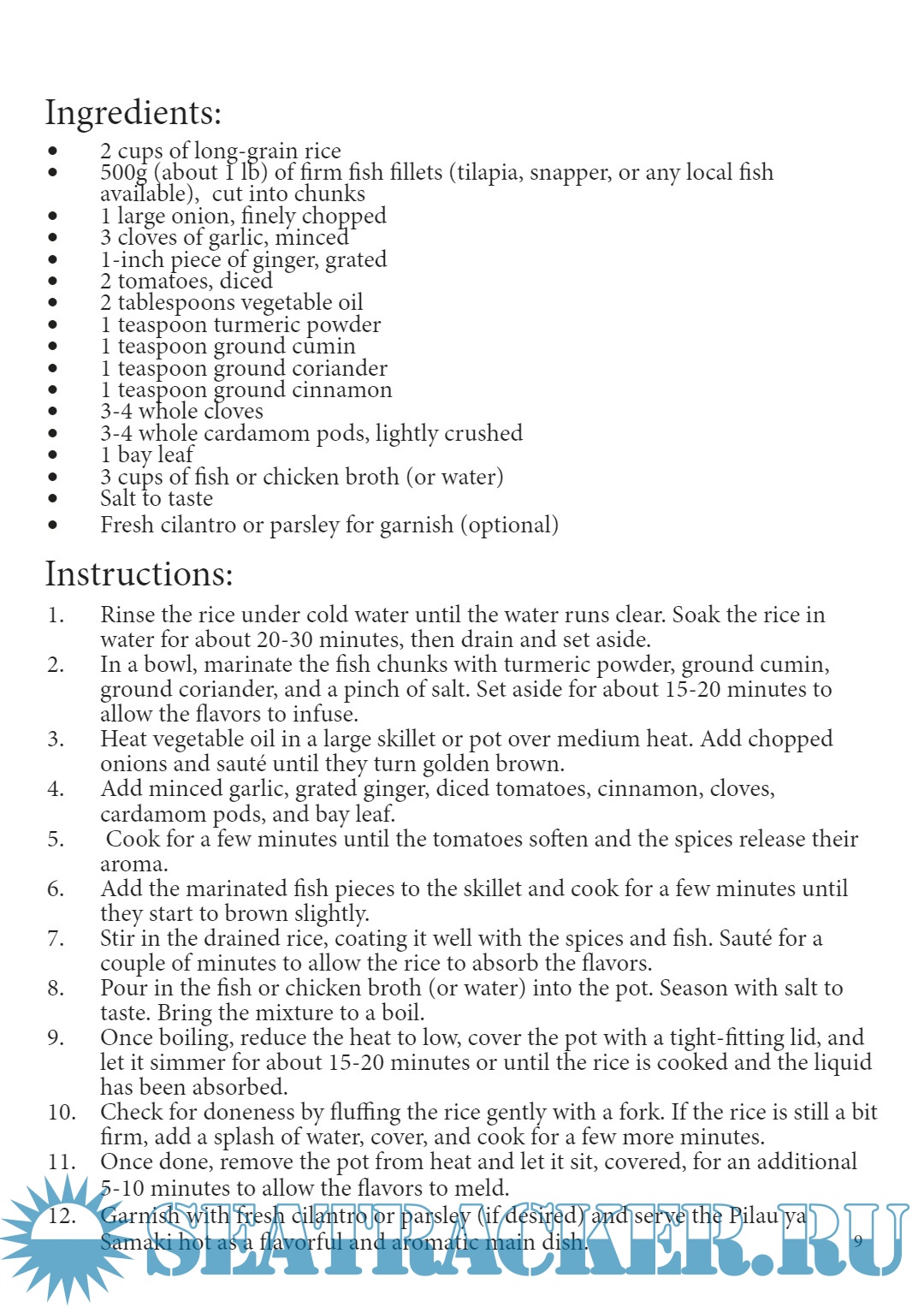 Year: 2024 Language: English Author: Magic Media ApS Genre: Periodical (magazine) Format: PDF Quality: eBook Pages count: 58 Description: Dive into the tantalizing flavors of Tanzania’s coastal bounty with our seafood cookbook. A culinary odyssey that celebrates the vibrant and diverse marine treasures found along the country’s Indian Ocean shores. Join us as we embark on a gastronomic journey through the rich tapestry of coastal life and explore the tantalizing world of Tanzanian seafood cuisine. Nestled along the eastern coast of Africa, Tanzania boasts a rich maritime heritage that has shaped its culinary traditions for centuries. From the bustling fish markets of Dar es Salaam to the tranquil shores of Zanzibar, this cookbook invites you to discover the exquisite flavors and innovative preparations that showcase the bounty of the ocean. Within these pages, you’ll find a treasure trove of seafood delights, from the delicate and aromatic aromas of Zanzibar’s tantalizing fish curries to the succulent and fresh catches grilled to perfection along the coastal villages. Explore the artistry of Swahili-inspired seafood dishes, each recipe a harmonious blend of spices, coconut-infused sauces, and the freshest catches from the azure waters. All recipes are for 4 persons! Additional info: Food Recipes: Juma Saidi Mwakagenda Illustrated by: Induwara Jayanga