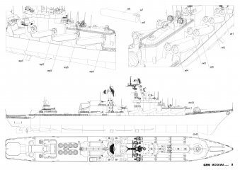Описание: 41 лист цветных выкроек и инструкций для изготовления бумажной модели ракетного крейсер "Москва" в масштабе 1:200