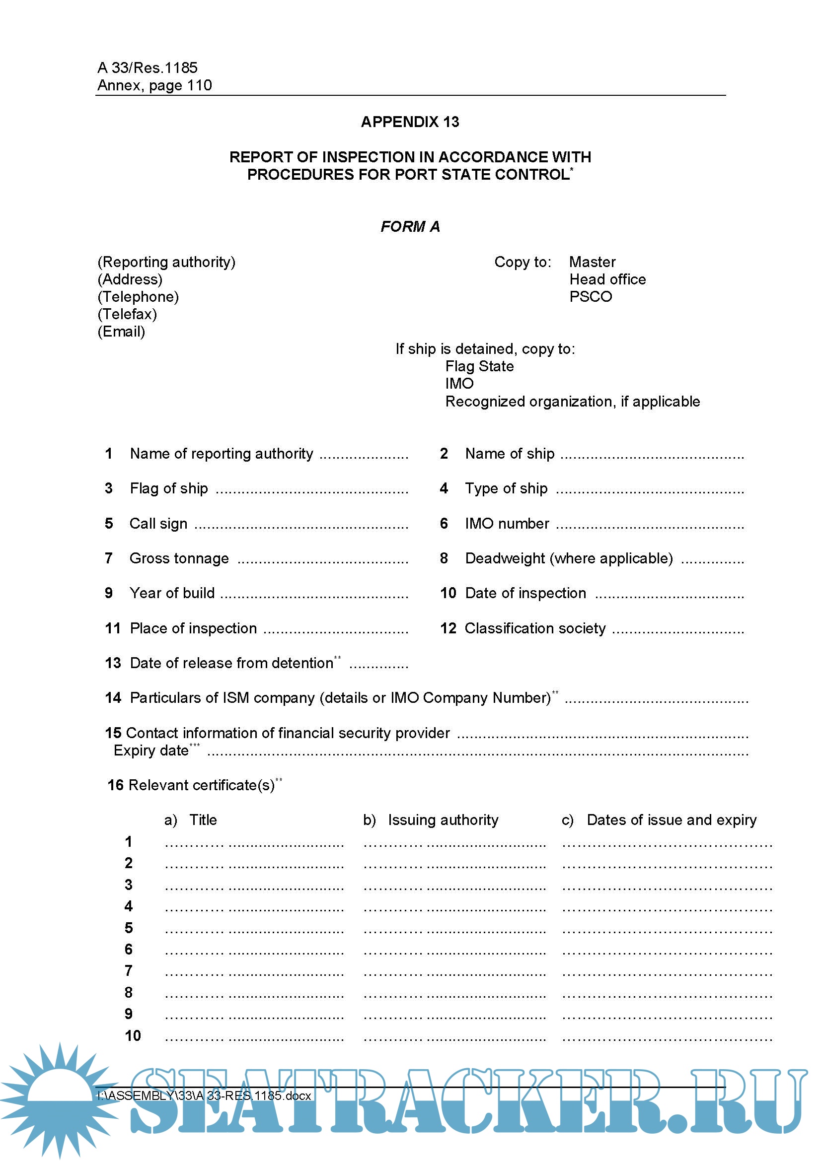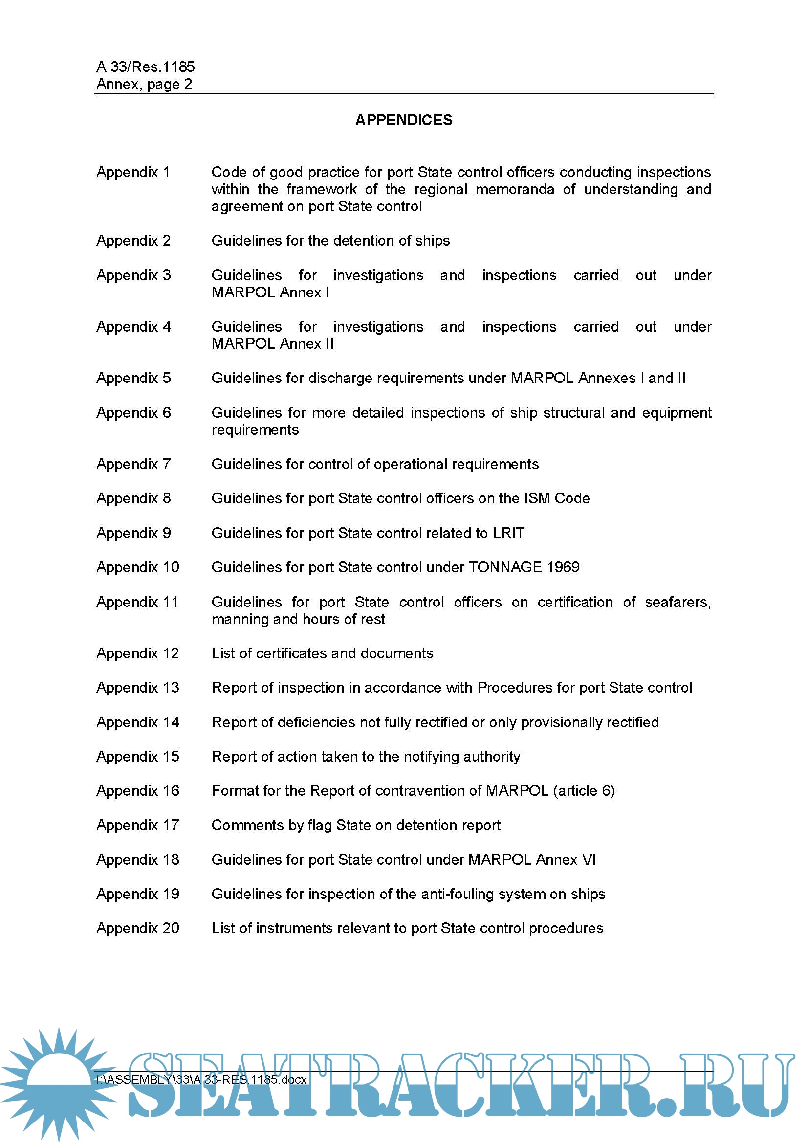 This edition includes amendments to Guidelines for the detention of ships (appendix 2) and Guidelines for port State control under MARPOL Annex VI (appendix 18), and new Guidelines for inspection of anti-fouling systems on ships (appendix 19).
