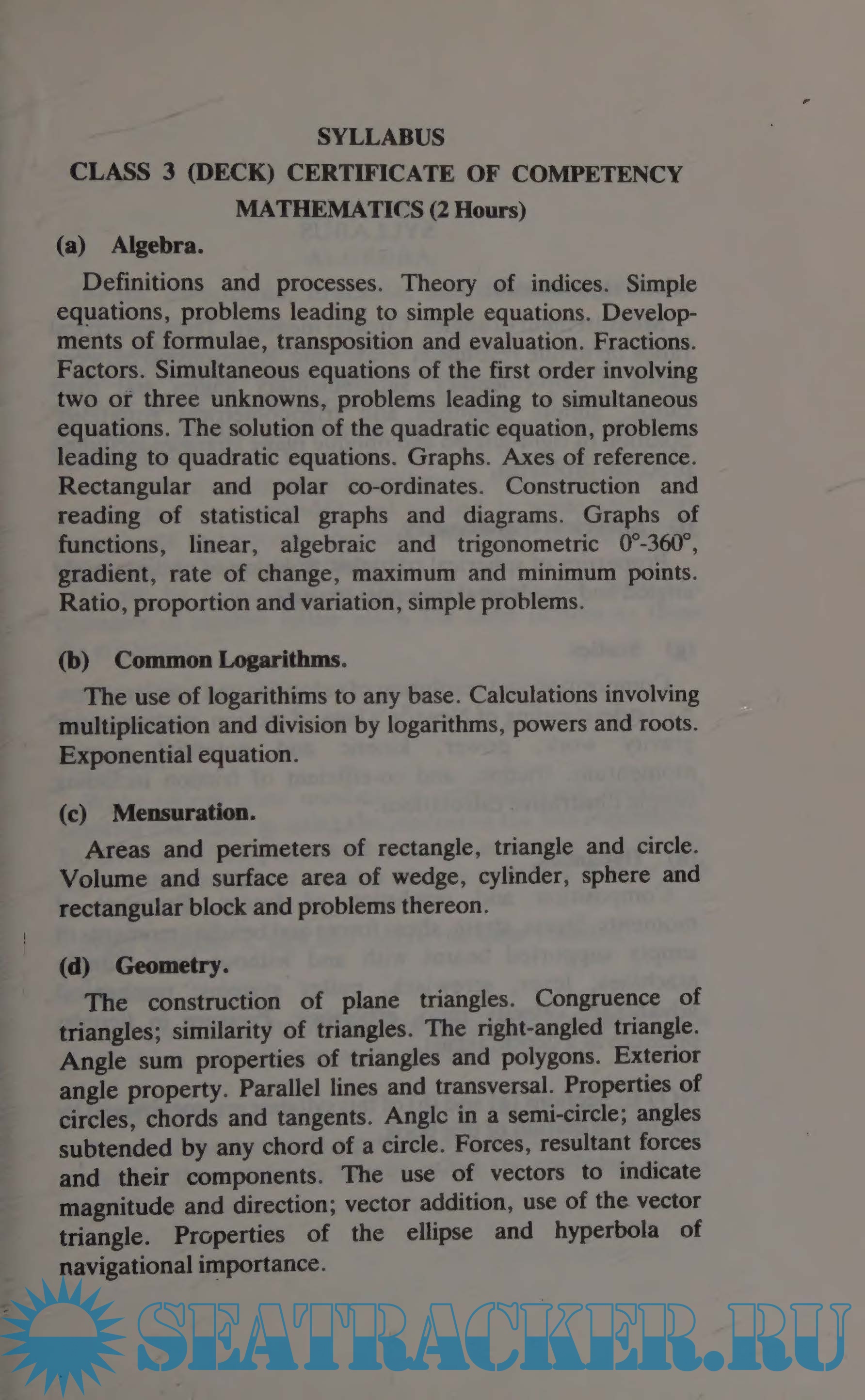 This text gives a grounding in elementary mathematics, including algebra, geometry and trigonometry. It covers the mathematics syllabus for Class 3 (Deck) Certificate of Competency and also includes spherical trigonometry, graphs and an introduction to calculus.