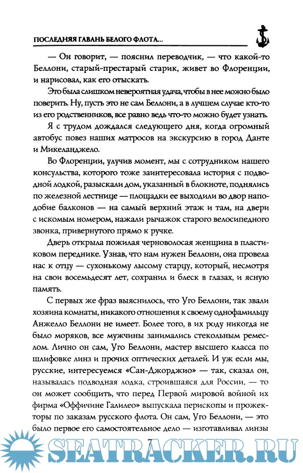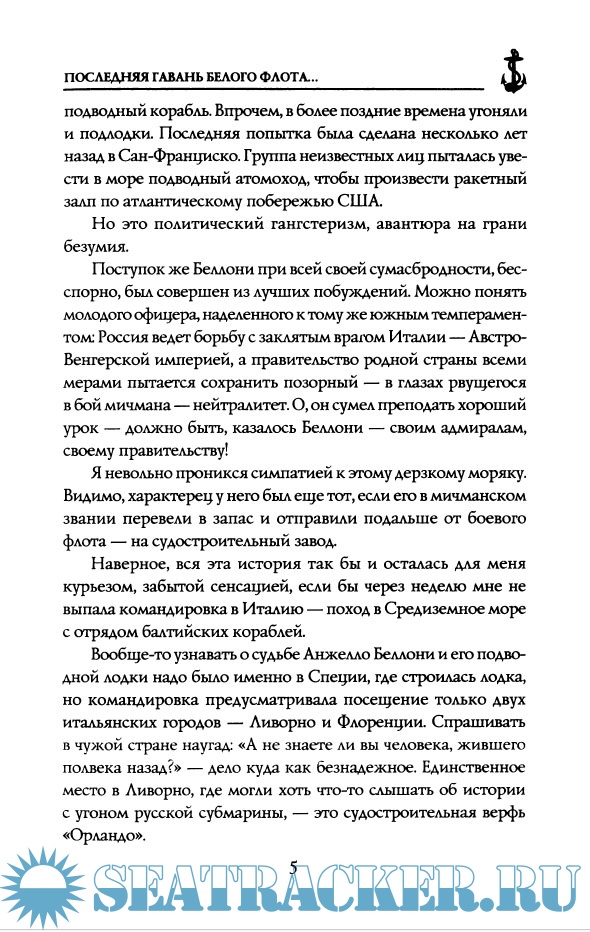 Описание: Книгу известного писателя-мариниста Николая Черкашина открывает документальная повесть о тяжелом и опасном переходе капитана И.И. Ризнича и его команды на подводной лодке "Святой Георгий" из Италии в Архангельск в 1917 году. Один из разделов книги - "Исходъ и поход" посвящен русской военной эмиграции, точнее русскому Исходу в 1920-м и более поздних годах. В ее основу положен путевой дневник автора, написанный во время уникального Морского похода по местам русского рассеяния, который прошел в 2010 году в Средиземном море под эгидой Фонда Всехвального Апостола Андрея Первозванного.