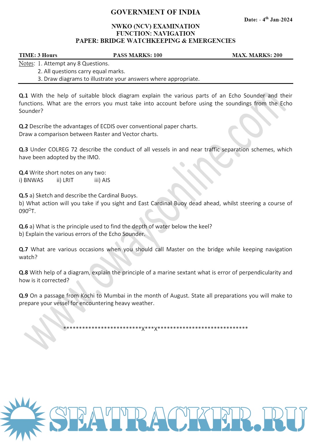 Description: Question paper sets for Officer In Charge of a Navigational Watch (Near Coastal Voyages) (NWKO NCV) Mercantile Marine Department (MMD), India Examinations.
