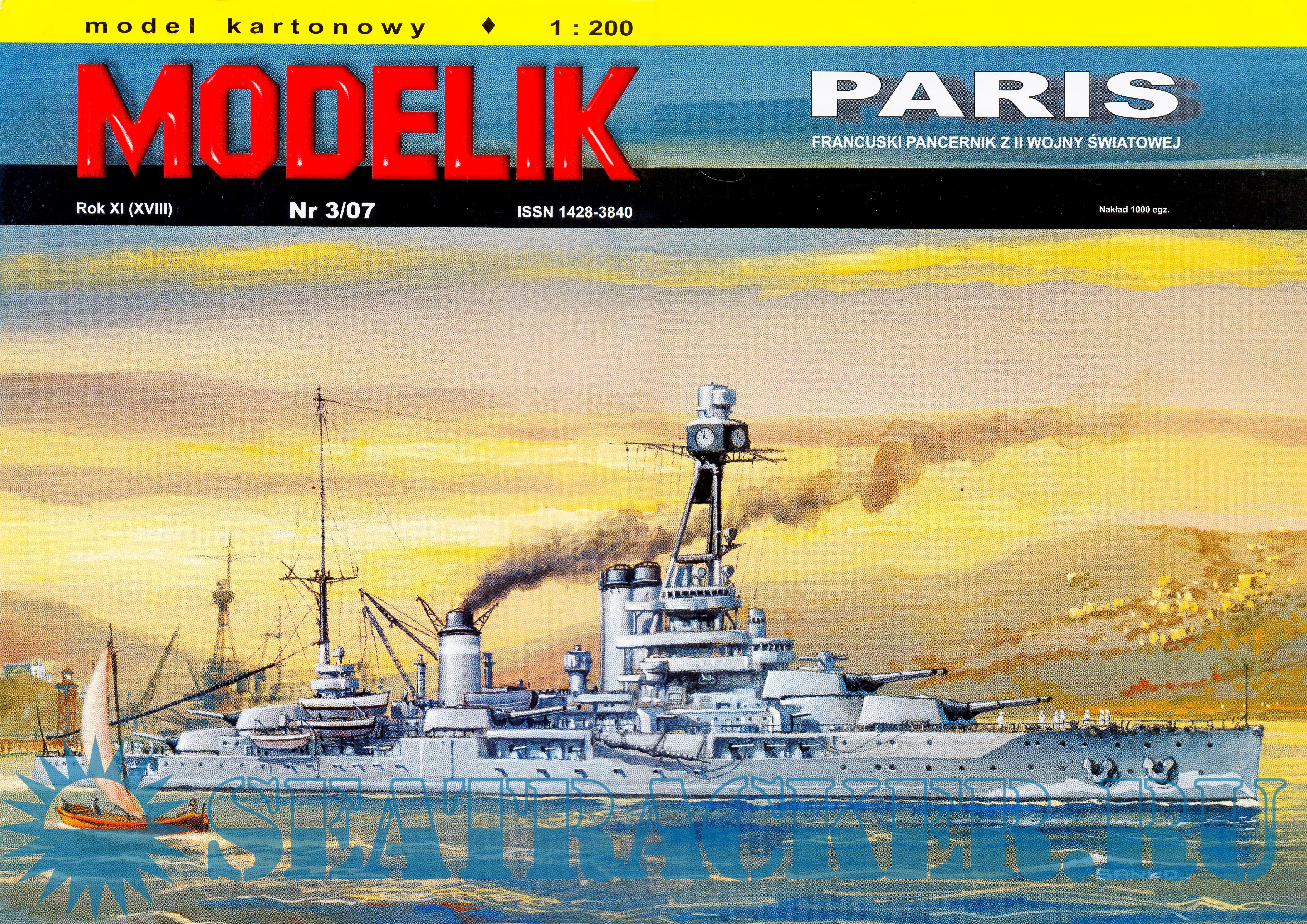Описание: 24 листа цветных выкроек и инструкций для изготовления бумажной модели французского броненосца "Paris" в масштабе 1:200