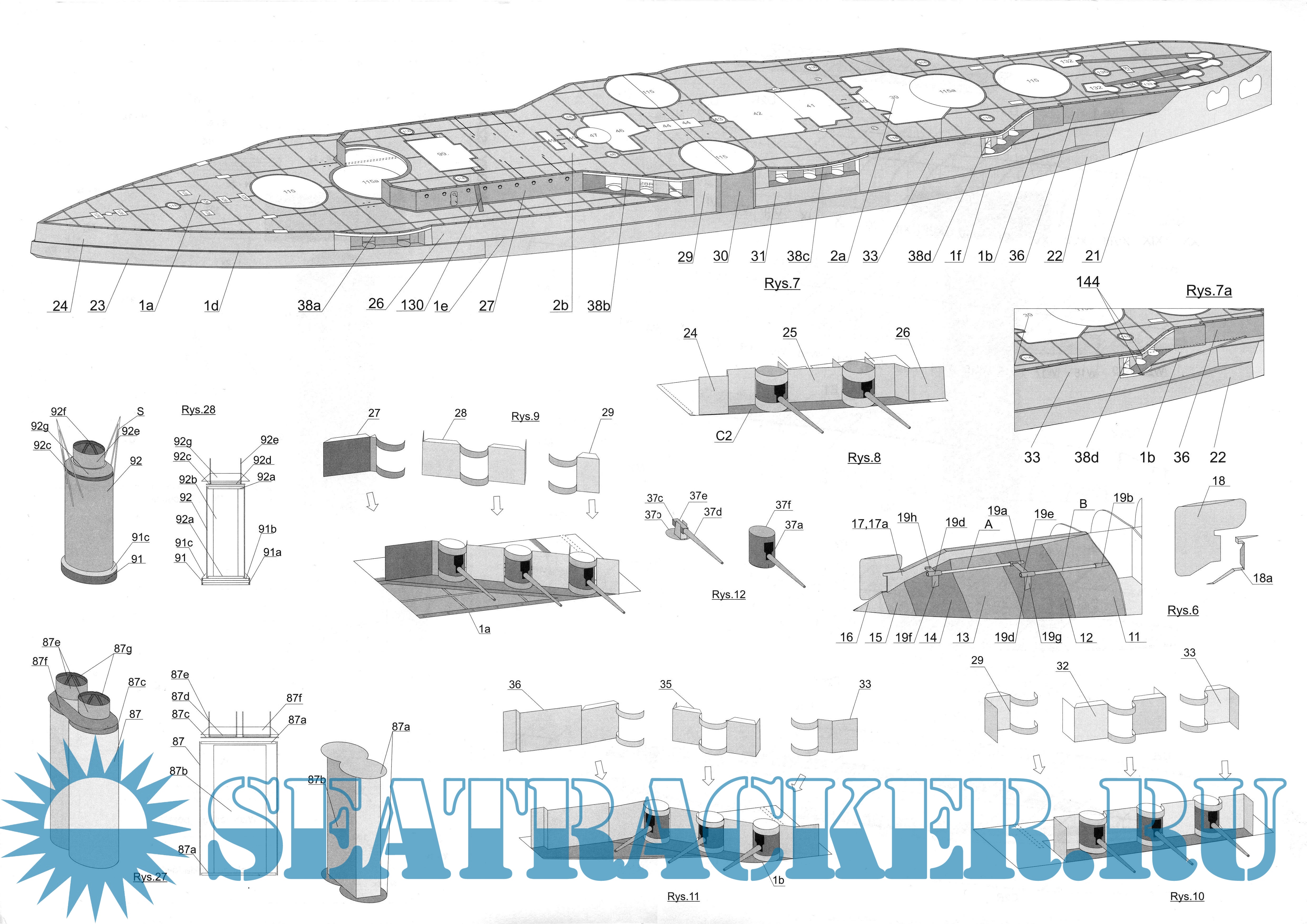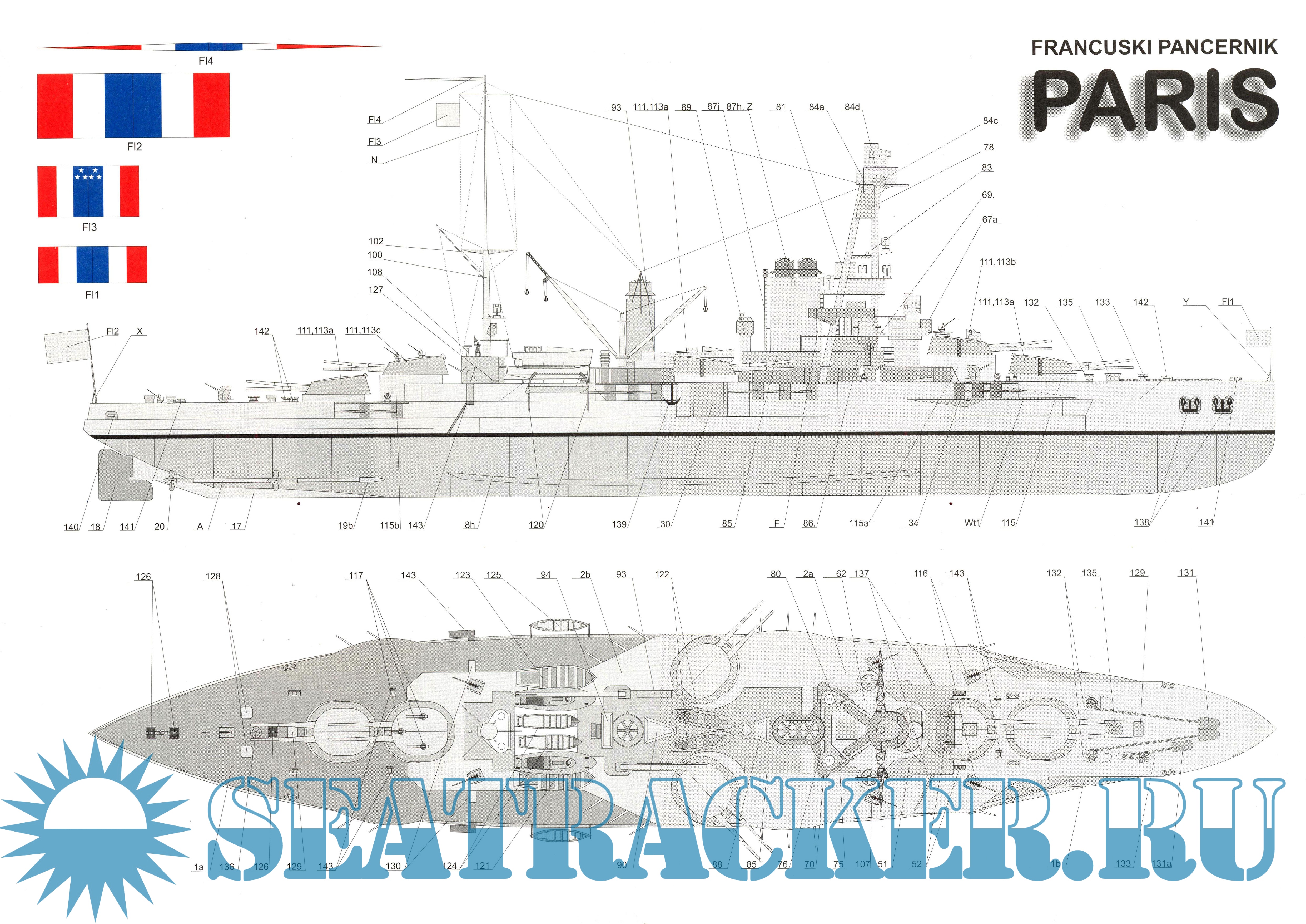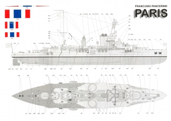 24 листа цветных выкроек и инструкций для изготовления бумажной модели французского броненосца "Paris" в масштабе 1:200