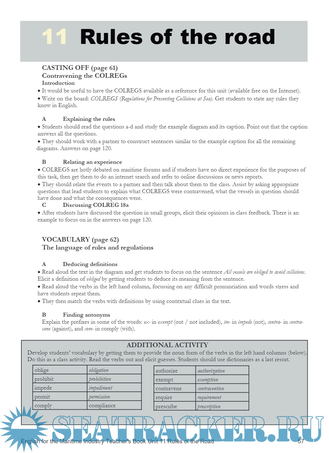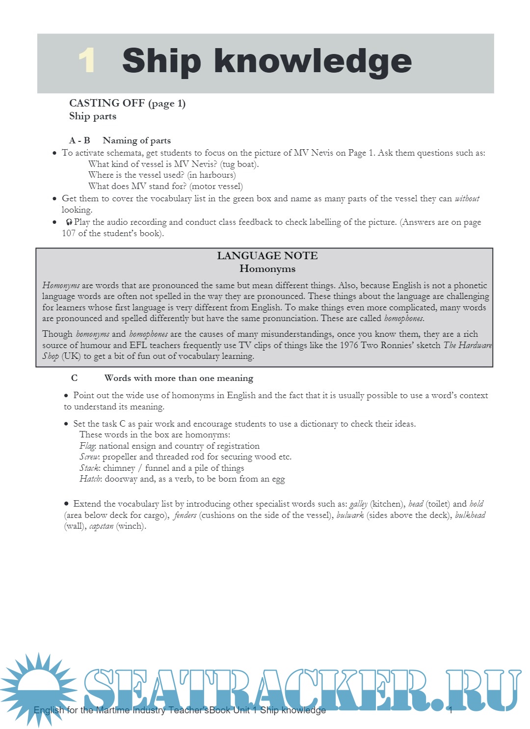 Year: 2014 Language: English Author: Tony Grice Genre: Textbook Publisher: Idris Format: PDF Quality: eBook Pages count: 82 Description: This teacher’s book is written to accompany the English language course book for seafarers English for the Maritime Industry - published by Idris Education (2012). This teacher’s book is free of charge and available in the form of a PDF download from the Idris Education website. The course book English for the Maritime Industry and its accompanying audio CD are not free of charge. They are available to buy from book distributors, book shops and through the website www.idrisconsultancy.co.uk. Answers to all the questions and exercises that appear in the course book are to be found in pages 107 -125 of the course book itself, and the answers are not repeated in this teacher’s book. However, the teacher’s book does contain the following which do not appear in the course book: - Extra teaching suggestions - Background theoretical language notes - Language exercises which are additional to those in the course book - Games, puzzles, role plays and discussions to provide extra speaking practice