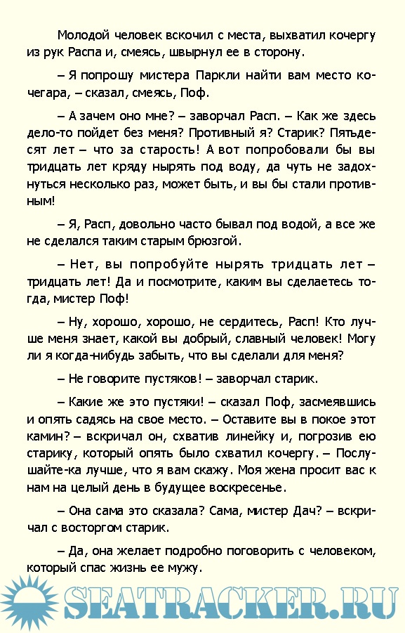 Содержание Сокровища глубин Глава I. Контора водолазных аппаратов Глава II. Золотые обещания Глава III. Под водой Глава IV. Домашний очаг Глава V. Сон наяву Глава VI. Приятный вечер Глава VII. Борьба Глава VIII. Нарушение соглашения Глава IX. Показание Полло Глава Х. Побег Глава XI. Наконец отправились Глава XII. В каюте Бесси Глава XIII. Приговор доктора Глава XIV. Подозрения капитана Глава XV. Утопающий Глава XVI. Безмолвное море Глава XVII. Окум ошибся.... Глава XVIII. Покровители сокровищ Глава XIX. У сокровищ Глава XX. Угощение для акул Глава XXI. Открытие Глава XXII. Опасность Глава XXIII. Тень сгущается Глава XXIV. Подводная экскурсия Глава XXV. Хитрая лисица Глава XXVI. Приключение Распа Глава XXVII. Доклад Полло Глава XXVIII. Хорошее намерение Глава XXIX. Тревоги Эстеры Глава XXX. Борьба за жизнь Глава XXXI. Пробуждение Глава XXXII. Смертельная борьба. Глава XXXIII. Ренегаты Глава XXXIV. Как непостоянны друзья Глава XXXV. Посол Окума Глава XXXVI. Рассказ Сэма Окума Глава XXXVII. Тайная услуга Глава XXXVIII. Словно серая змея Глава XXXIX. Дач в опасности Глава XL Планы Распа Глава XLI. Пленники Глава XLII. Рассказ Сэма Окума Глава XLIII. Прощайте Глава XLIV. Недоумение Глава XLV. Мщение Лоре Глава XLVI. Катастрофа Глава XLVII. Заключение