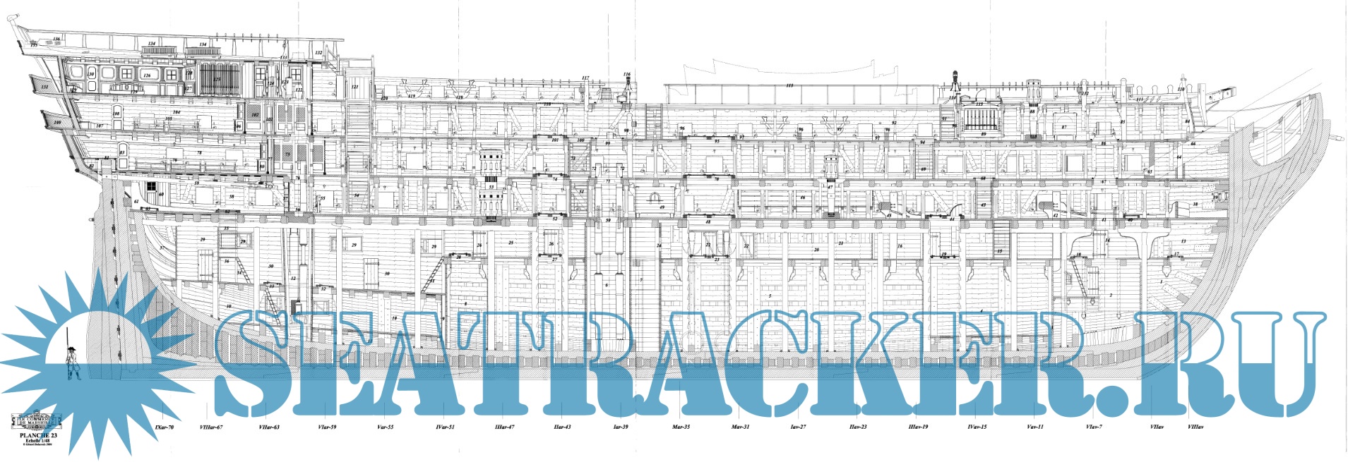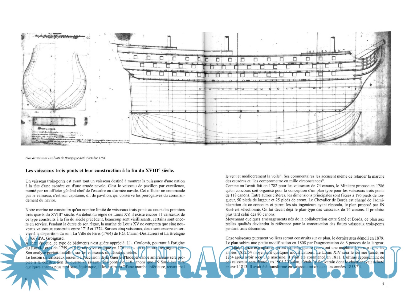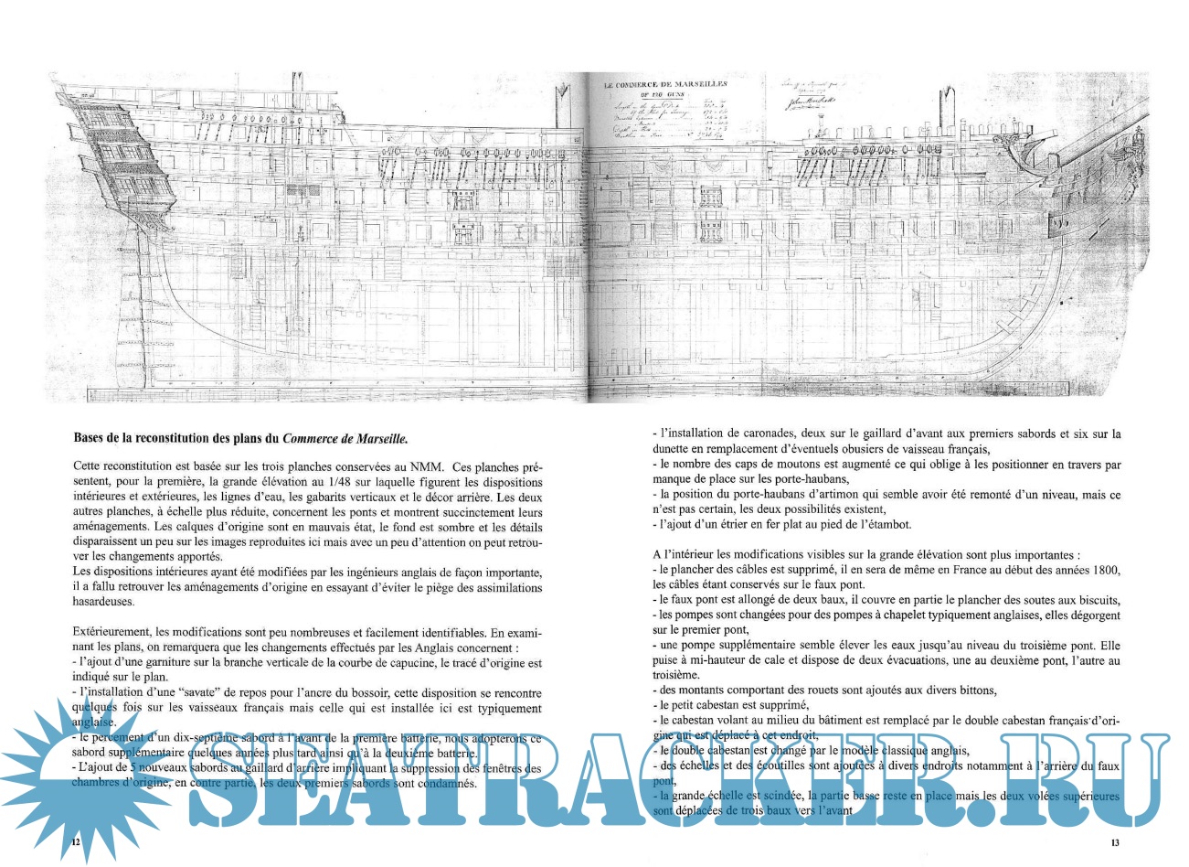 Description: Корабли первого ранга (так же называемые трехдечными) конца XVIII века всегда были интересны судомоделистам. С командой из более чем тысячи моряков, эти корабли несли от 112 до 132 пушек на четырех или пяти палубах. Как настоящие плавучие крепости, трехдечники этой эпохи останутся самыми большими деревянными кораблями, построенными когда-либо. Эта монография Жерара Делакруа содержит всю документацию, необходимую для изготовления модели корабля Le Commerce de Marseille. Данный корабль был построен в Тулоне в 1788 году по чертежам корабельного мастера Сане. Этот талантливый инженер являлся автором чертежей типичного фрегата, 74-х, 80-ти и 118-ти пушечных кораблей. Корабли, поостренные по его чертежам, составляли мощь французского флота в течение несколько десятилетий. 34 чертежа большого формата (до 90х170 см), включенных в эту объемную работу, содержат всю необходимую информацию для постройки даже адмиралтейской модели, если судомоделист захочет ее сделать. Комплект чертежей также дает возможность слегка модифицировать модель для того, чтобы построить возможную версию корабля L'Orient, который затонул во время битвы на Ниле в 1798 году. Как и ранее, даны подробные чертежи всех дельных вещей, рангоута и парусов.