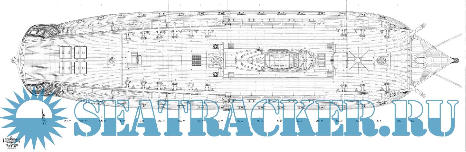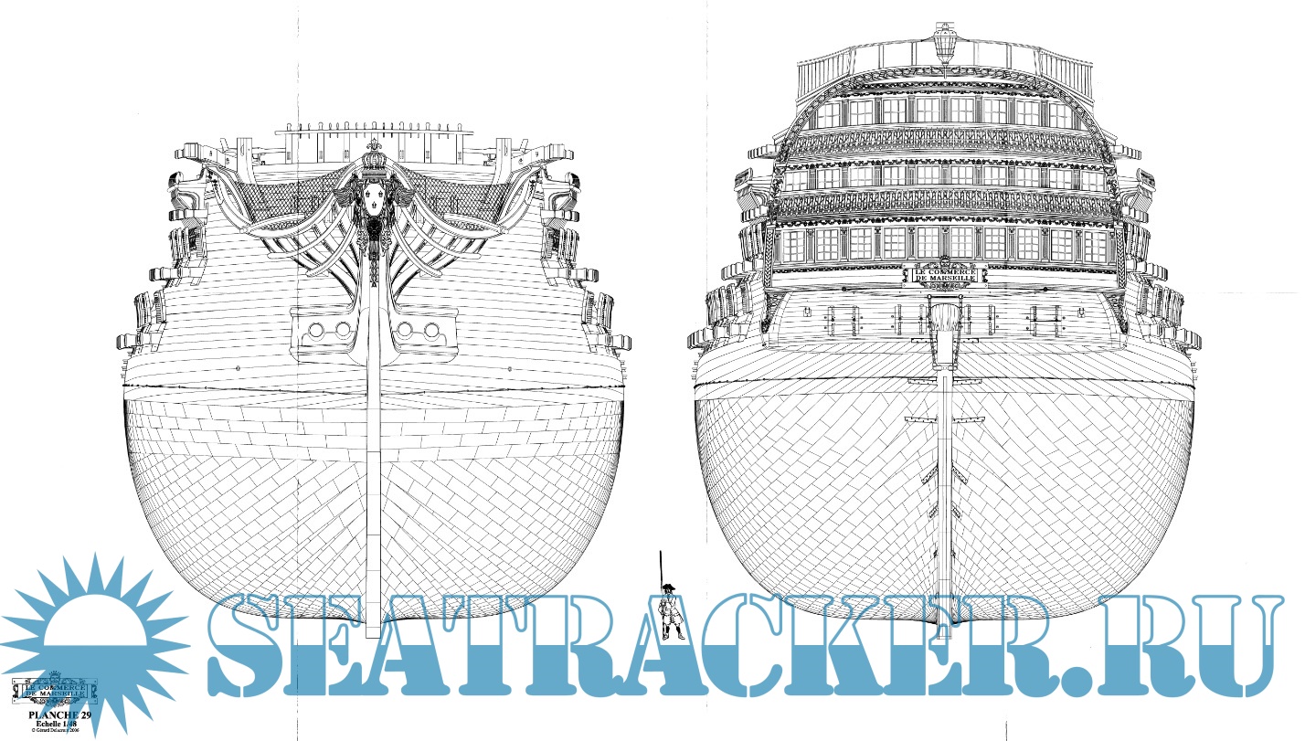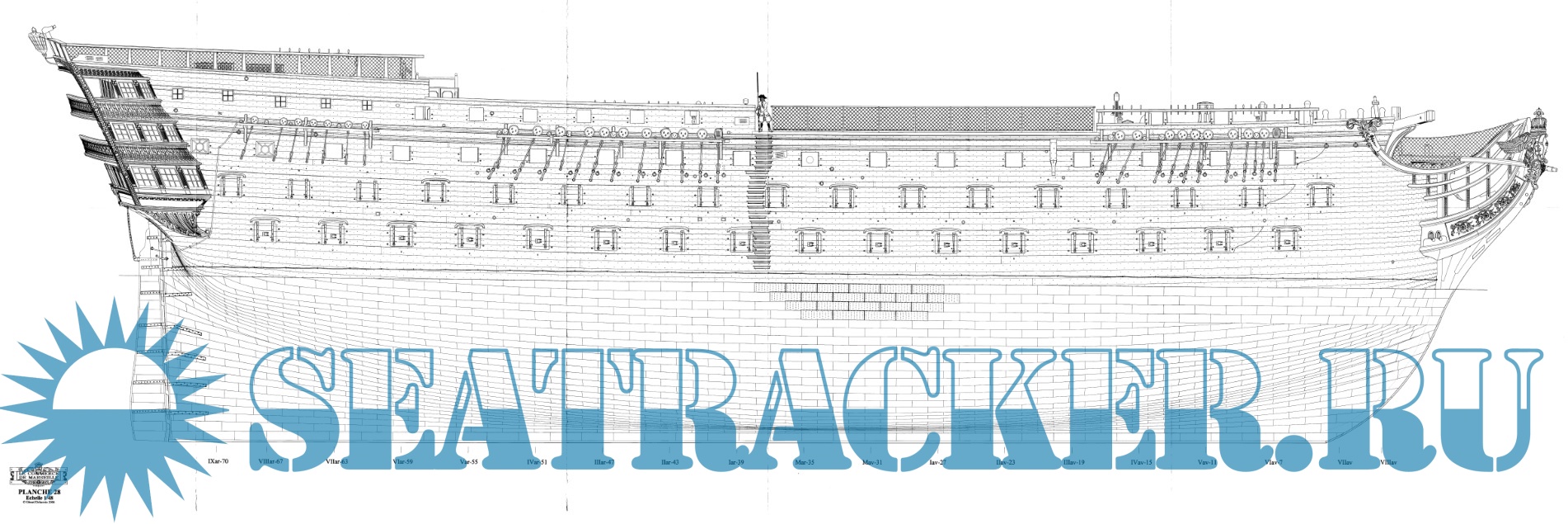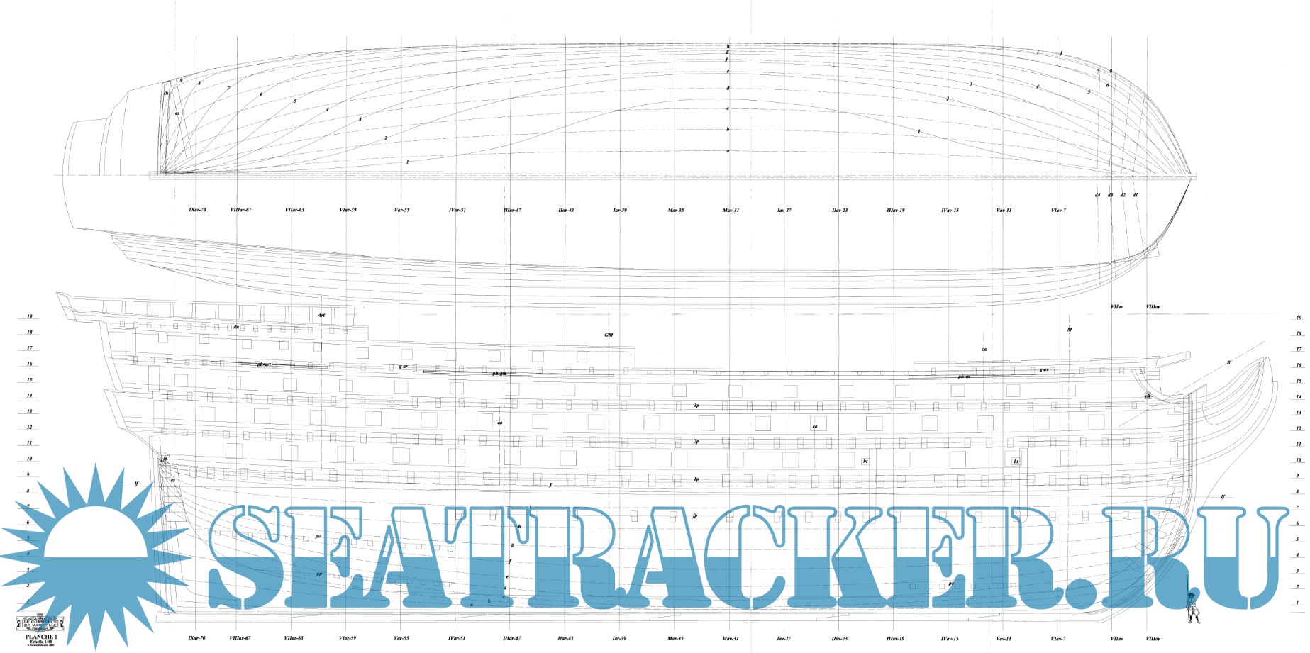 Description: Корабли первого ранга (так же называемые трехдечными) конца XVIII века всегда были интересны судомоделистам. С командой из более чем тысячи моряков, эти корабли несли от 112 до 132 пушек на четырех или пяти палубах. Как настоящие плавучие крепости, трехдечники этой эпохи останутся самыми большими деревянными кораблями, построенными когда-либо. Эта монография Жерара Делакруа содержит всю документацию, необходимую для изготовления модели корабля Le Commerce de Marseille. Данный корабль был построен в Тулоне в 1788 году по чертежам корабельного мастера Сане. Этот талантливый инженер являлся автором чертежей типичного фрегата, 74-х, 80-ти и 118-ти пушечных кораблей. Корабли, поостренные по его чертежам, составляли мощь французского флота в течение несколько десятилетий. 34 чертежа большого формата (до 90х170 см), включенных в эту объемную работу, содержат всю необходимую информацию для постройки даже адмиралтейской модели, если судомоделист захочет ее сделать. Комплект чертежей также дает возможность слегка модифицировать модель для того, чтобы построить возможную версию корабля L'Orient, который затонул во время битвы на Ниле в 1798 году. Как и ранее, даны подробные чертежи всех дельных вещей, рангоута и парусов.