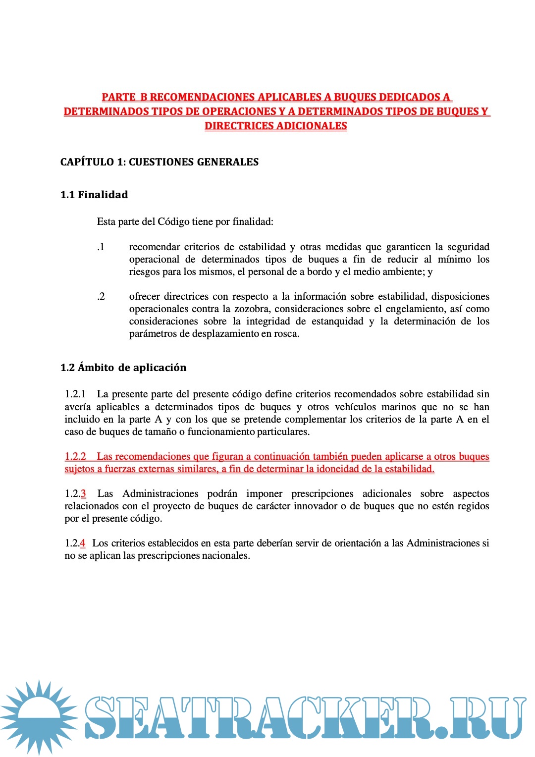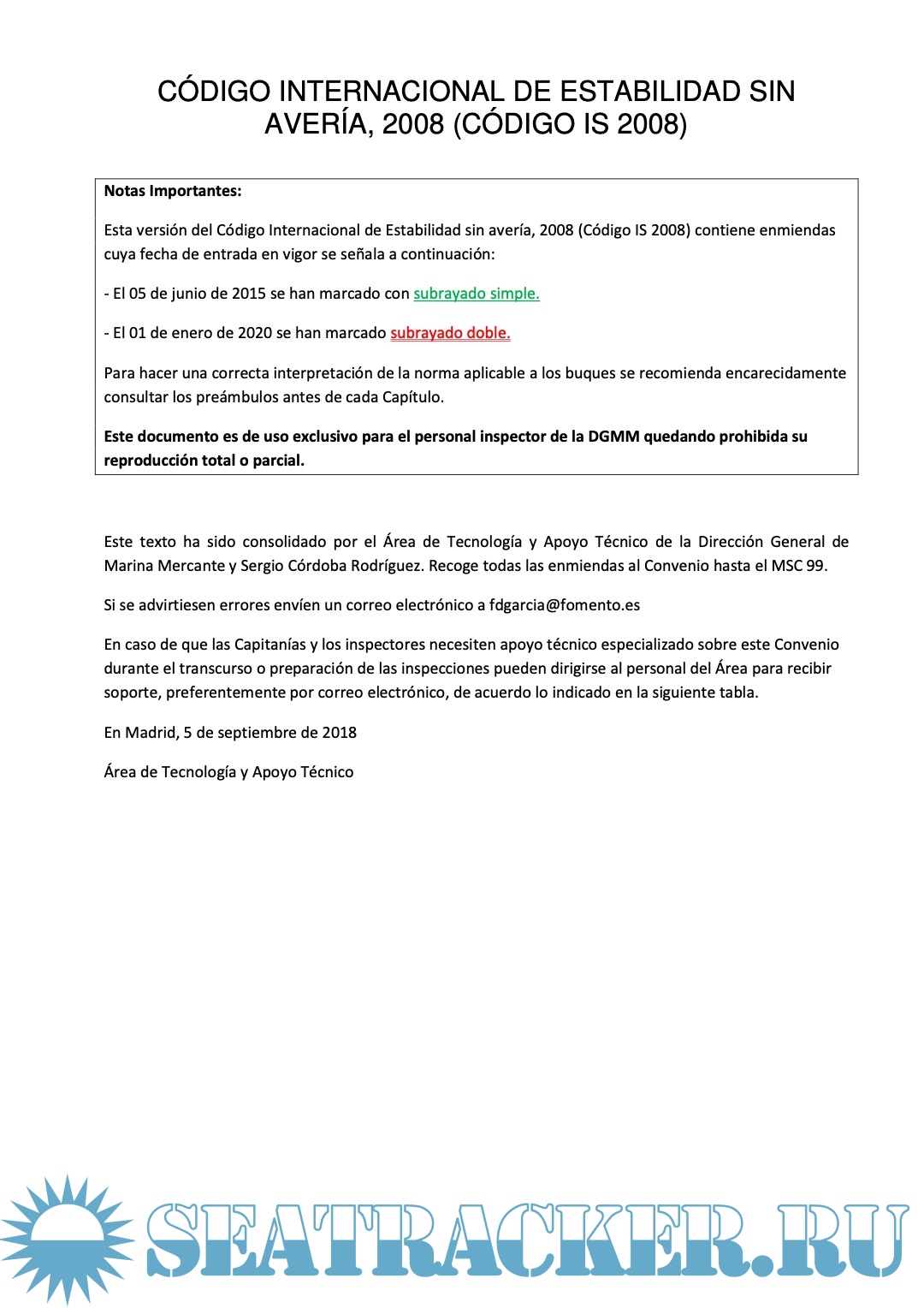 Description: 1 El presente código ha sido elaborado con objeto de ofrecer en un solo documento las disposiciones obligatorias de la Introducción y la parte A, junto con las disposiciones recomendadas de la parte B sobre estabilidad sin avería, basadas primordialmente en los actuales instrumentos de la OMI. En los casos en que las recomendaciones del presente código difieran aparentemente de las de otros códigos de la OMI, prevalecerá lo dispuesto en dichos códigos. A fin de que sea lo más completo posible y para conveniencia del usuario, el presente código incluye también disposiciones que proceden de instrumentos obligatorios de la OMI.