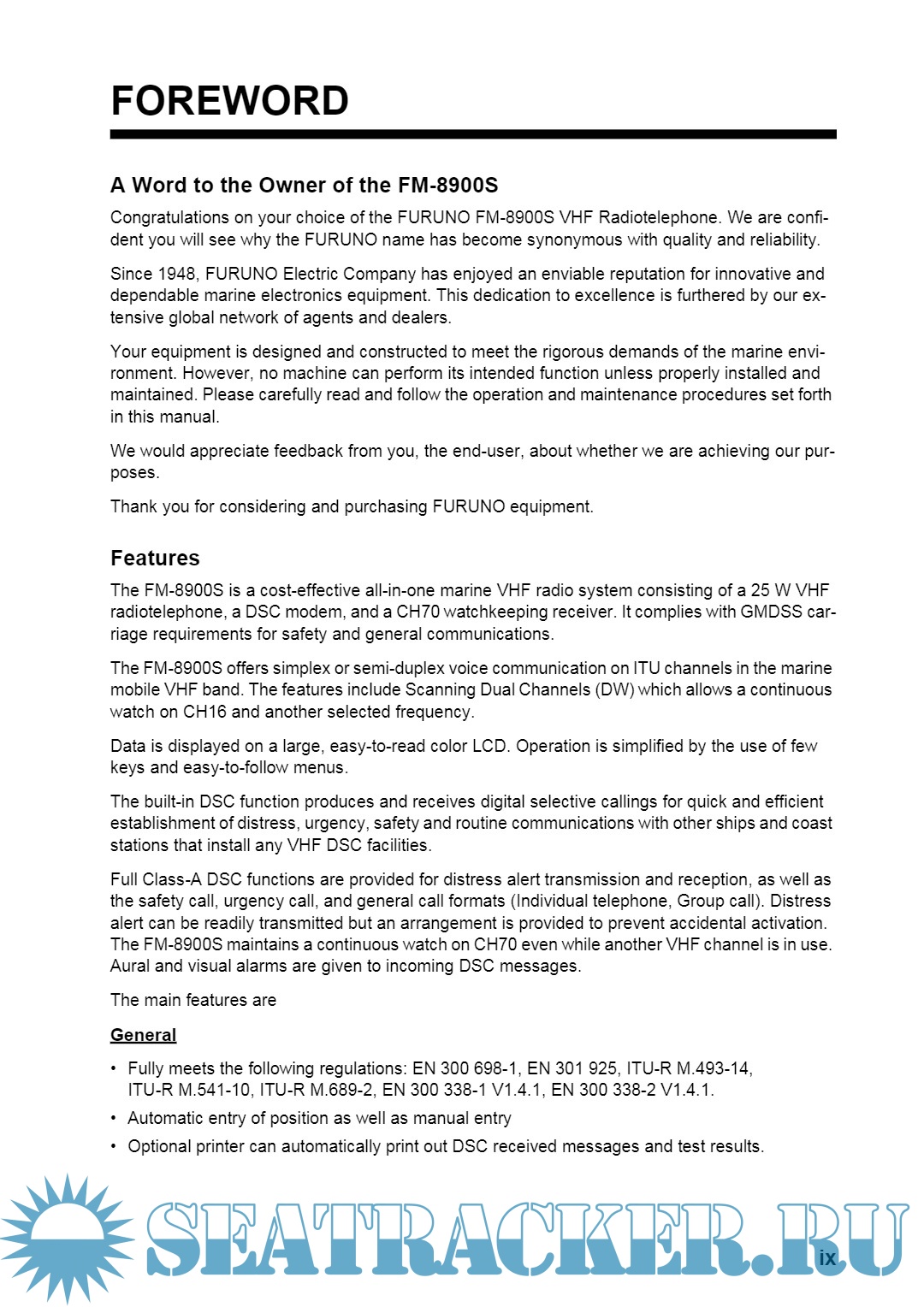 Description: This Operator's manual describes precautions, operations and troubleshooting of FURUNO VHF RADIO TELEPHONE FM8900S