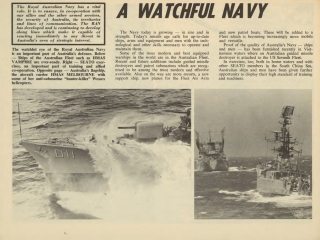 Description: The first editions of Navy Today were published in the early 1960s to provide a snapshot of the contemporary RAN Fleet and a brief commentary on operations in which the RAN was involved. The booklets were distributed by Navy Public Relations and through Navy Recruiting centres around Australia and were produced in various formats until the mid 1990s at which time web-based technology took over.