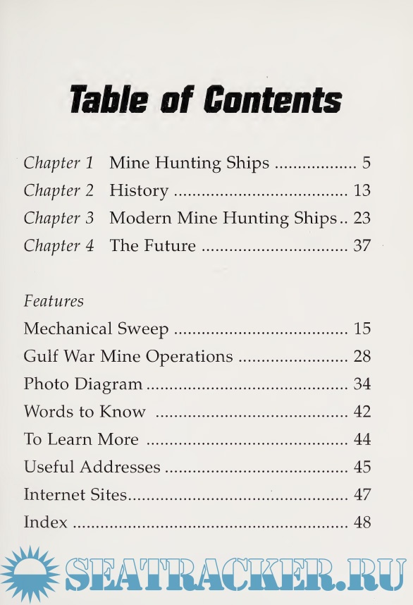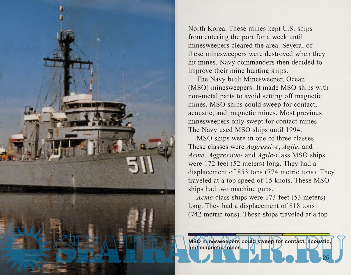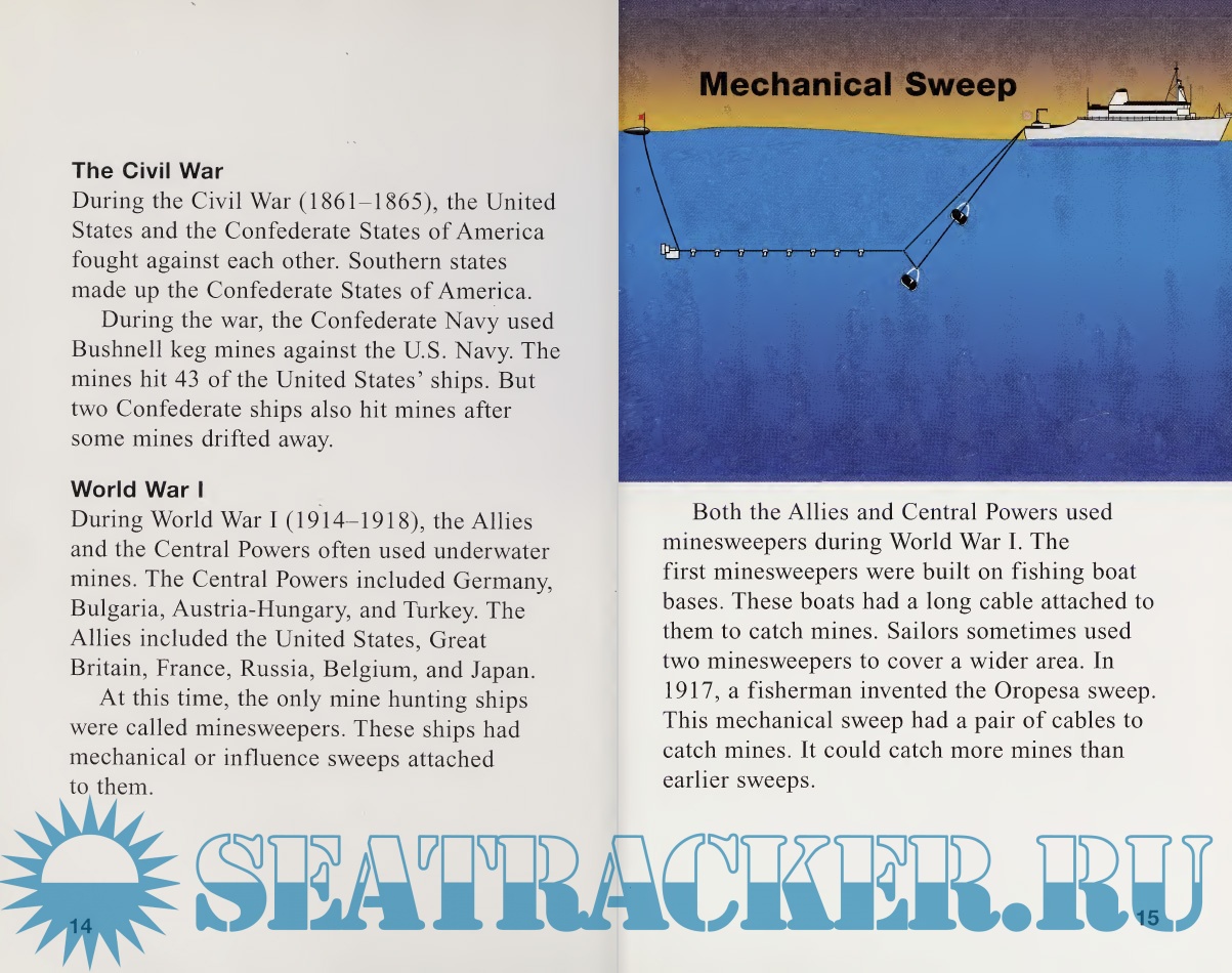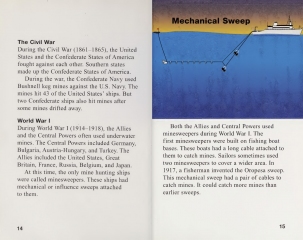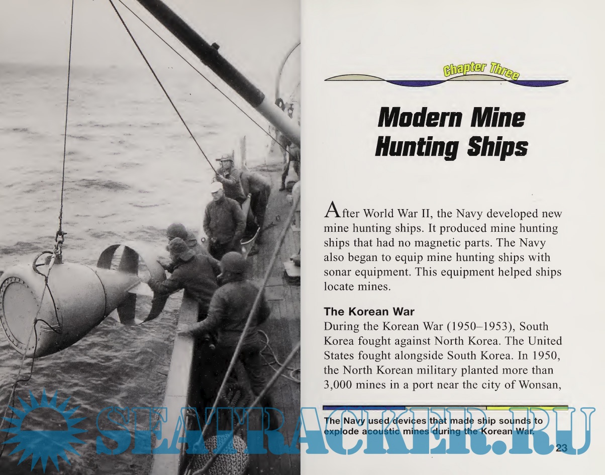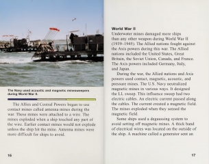Description: Provides information about different types of mines and explains the history of mine hunting ships and how they hunt for and deactivate mines.