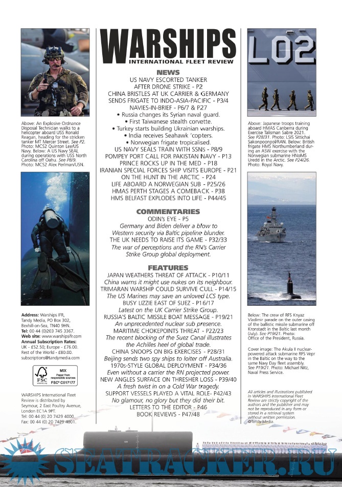Description: Warships IFR puts the spotlight on the latest developments in the world’s navies. It covers current defence issues and has comments by leading analysts. The magazine regularly includes features on the Royal Navy and the US Navy in addition to incorporating news and features on all other navies across the globe. Warships IFR frequently carries in-depth articles on naval heritage.WARSHIPS International Fleet Review is published 12 times a year by Tandy Media Ltd who also publish Shipping Today & Yesterday (which provides news and features from the world of merchant shipping).