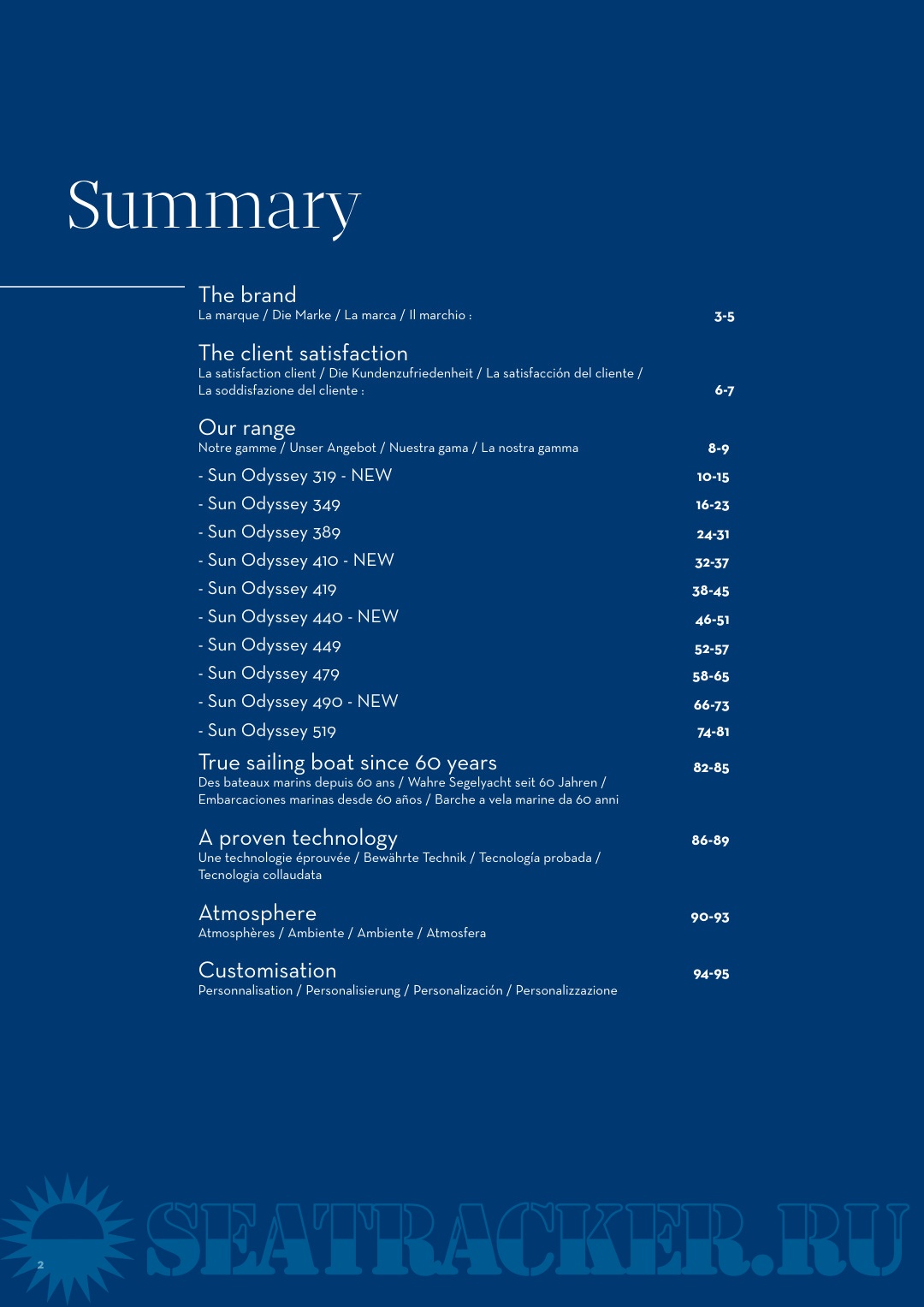 Year: 2019 Language: English, French, German, Spanish, Italian Author: Collective Genre: Catalog Format: PDF Quality: eBook Pages count: 96 Description: The Sun Odyssey range confirms the success of sailboats with true Jeanneau features : Elegance, inventiveness and security. Onboard the comfort is served by a timeless design, performance is achieved without effort, and above all, safety at sea is guaranteed. Ideal for your family cruises.