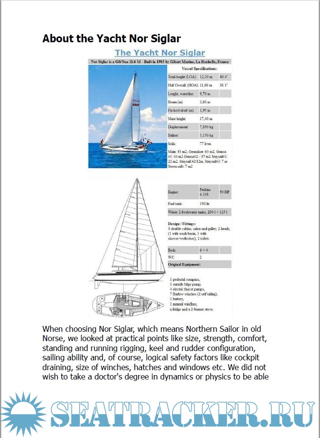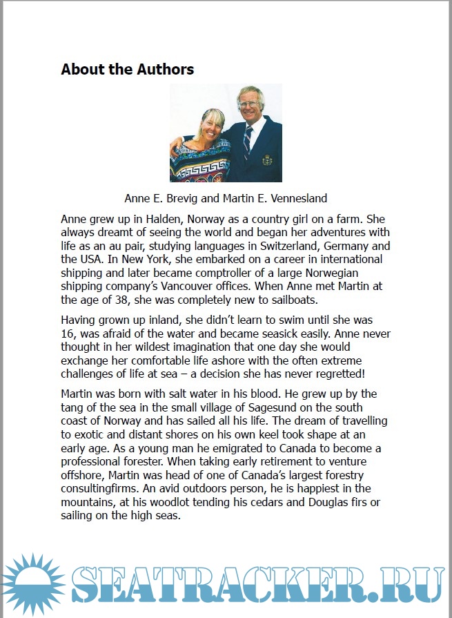Год выпуска: 2013 Язык: Английский Автор: Anne E. Brevig and Martin Vennesland Издание: 1 Формат: PDF Качество: Изначально компьютерное (eBook) Количество страниц: 106 Описание: At the peak of their careers, Anne Brevig and Martin Vennesland made the decision of their lives: they chose freedom and a highly uncertain future on the high seas instead of secure jobs and the safety and comfort of life ashore. In order to finance their dream, they sold their house and most of their belongings and moved onboard their 40-foot sailboat. It became their one and only home for 15 years. Neither imagined that they were going to spend 9 years on the 7 seas and journey more than 56,000 nautical miles! NOR SIGLAR’s blue water adventure is not about breaking any records. Its main focus is meeting people from different backgrounds and cultures - encounters that take on entirely different dimensions when sailing off the beaten track far away from the traditional tourist routes. “Why are you rushing through Paradise?” homesteaders on an exotic Robinson Crusoe island asked. The question became a motto for Anne and Martin during the rest of their voyage. Slowing down, they were able to establish personal contacts with locals. The book is saturated with enchanting encounters, unique experiences and drama. They also found that paradise still exists and can be explored. Anne and Martin have crossed the big oceans and visited 76 countries and island nations. They have realized their dreams. Now they hope that their book will inspire others to pursue their dreams - to dare to take the leap. It certainly gives a rare opportunity to live vicariously in NOR SIGLAR’S wake.