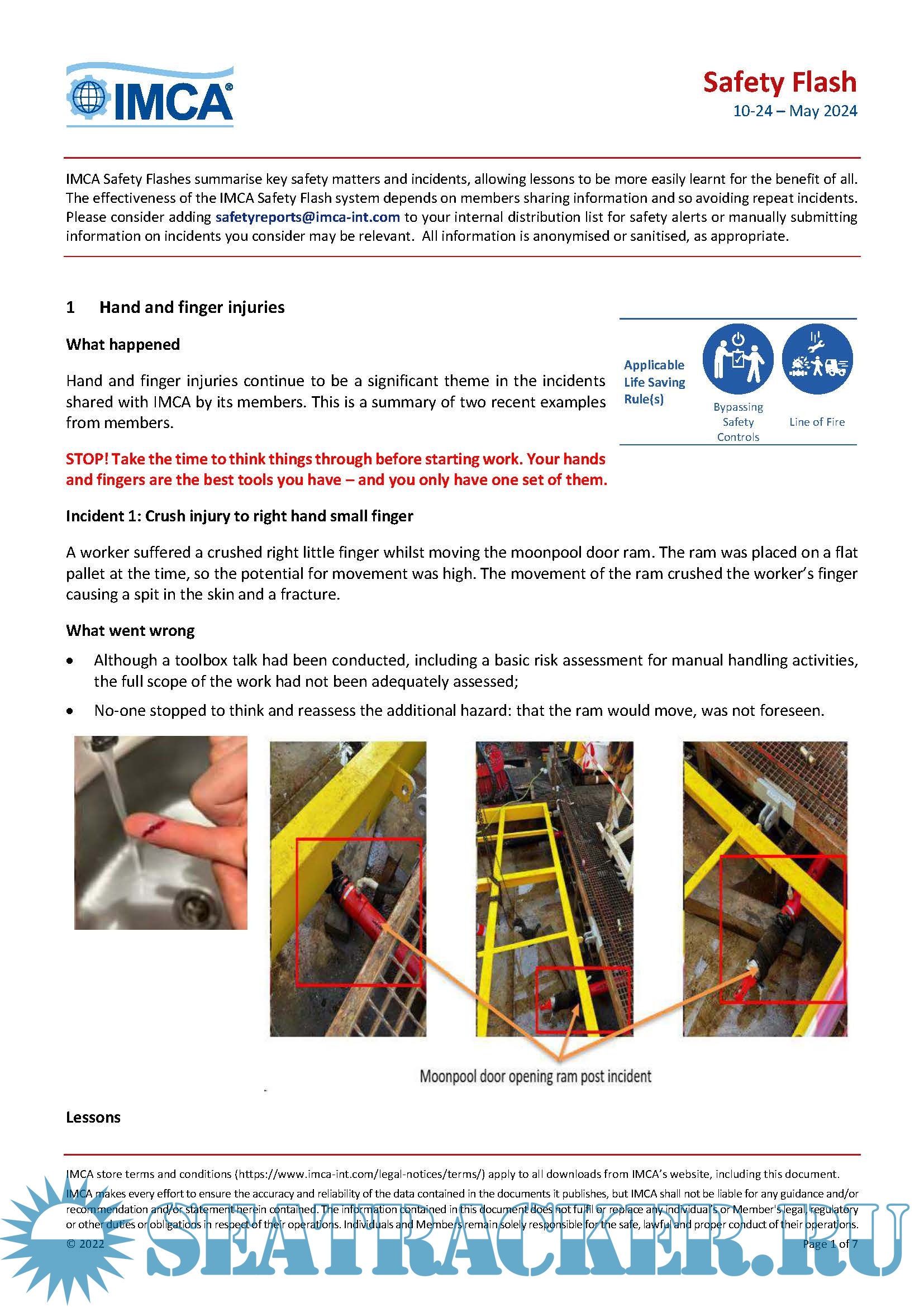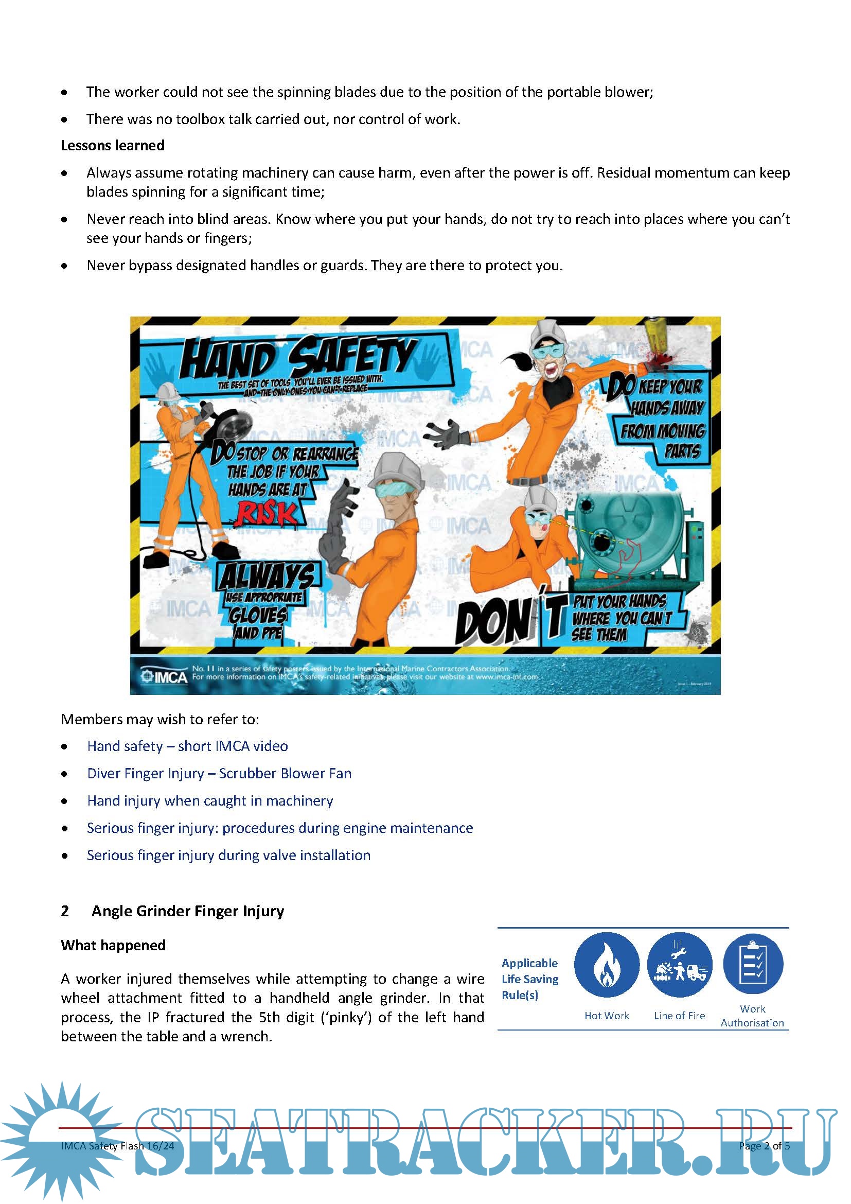 IMCA SF 17/24 Non-fatal man overboard: worker fell from height into the sea LTI – person fell from step ladder Parted tag line caused damage during lifting operations Dropped object during cable trans-spooling Lifeboat air cylinder explosion on an empty installation Aug 2024 IMCA SF 16/24 LTI: fingers severed by spinning fan blade Angle Grinder Finger Injury Crew member cut hand on broken glass during heavy weather Arm injury from metal skip cover MSF: Serious hand injury – high pressure air Aug 2024 IMCA SF 15/24 Side scuttle (porthole) knocked out by wave impact Dropped object: unsecured cargo inside box broke lose and fell Load lost from lorry on public road – inadequate securing of cargo Fast Rescue Boat (FRC) comes close to falling off in a dry dock MAIB: LTI - a wedge shattered causing injury Jul 2024 IMCA SF 14/24 Loss of pressure to diver’s primary air supply Equipment fell on someone’s leg causing injury Electric shock after water ingress to switch Emergency musters and drills Bunker hose damaged during connection Jul 2024 IMCA SF 13/24 ROV dropped to seabed UK HSE: Service lifts on offshore and onshore wind turbines Dropped halogen lamp caused small fire MAIB: Man overboard – unguarded opening MAIB: A slip into the hold Jul 2024 IMCA SF 12/24 Swinging load after loss of position Dropped welding fume extraction hood Carriage of Methanol - Dangerous Goods - without proper certification Personnel exposed to hydrogen sulphide during maintenance MAIB: Person injured during lifting of compressor Jun 2024 IMCA SF 11/24 Dropped lifting beam due to parted soft strop Vessel collided with platform Diver’s umbilical trapped during a pipeline flooding operation Stored energy - dislodged pin causes injury MAIB: Leg injury while mooring Jun 2024 IMCA SF 10/24 Hand and finger injuries Crewmember suspended above deck by lifting equipment CTV crew member snagged on tag line and lifted off feet Engine failure and subsequent engine room fire BSEE: Welding and Burning Hazards