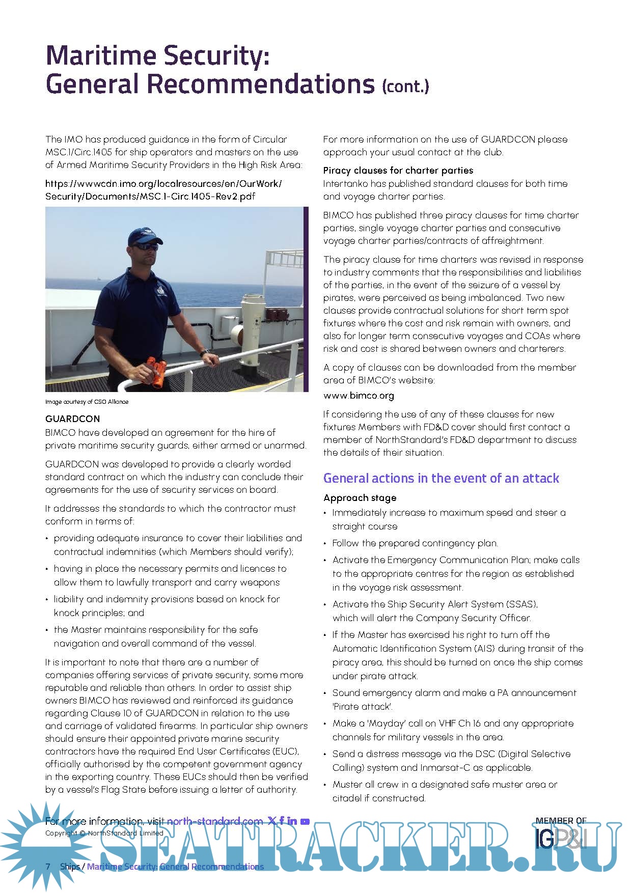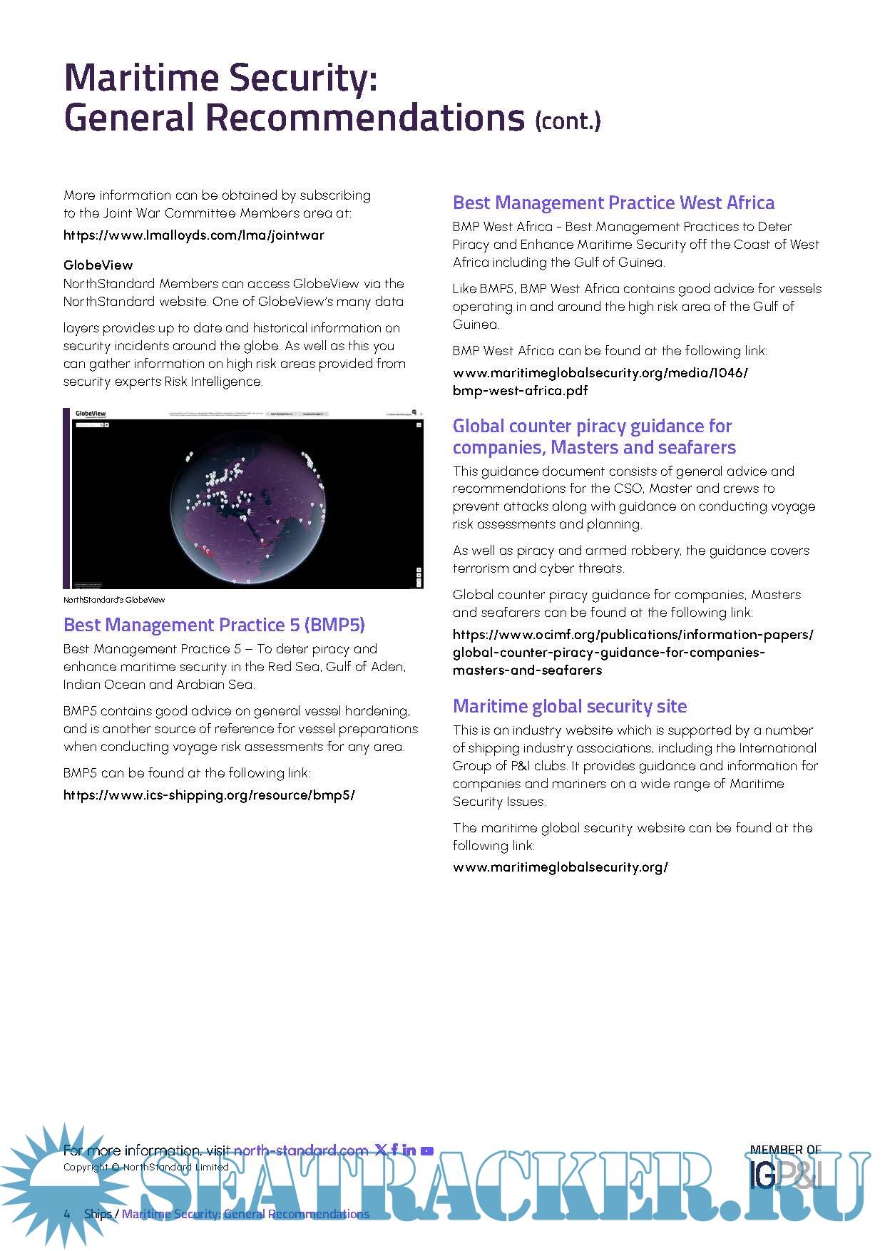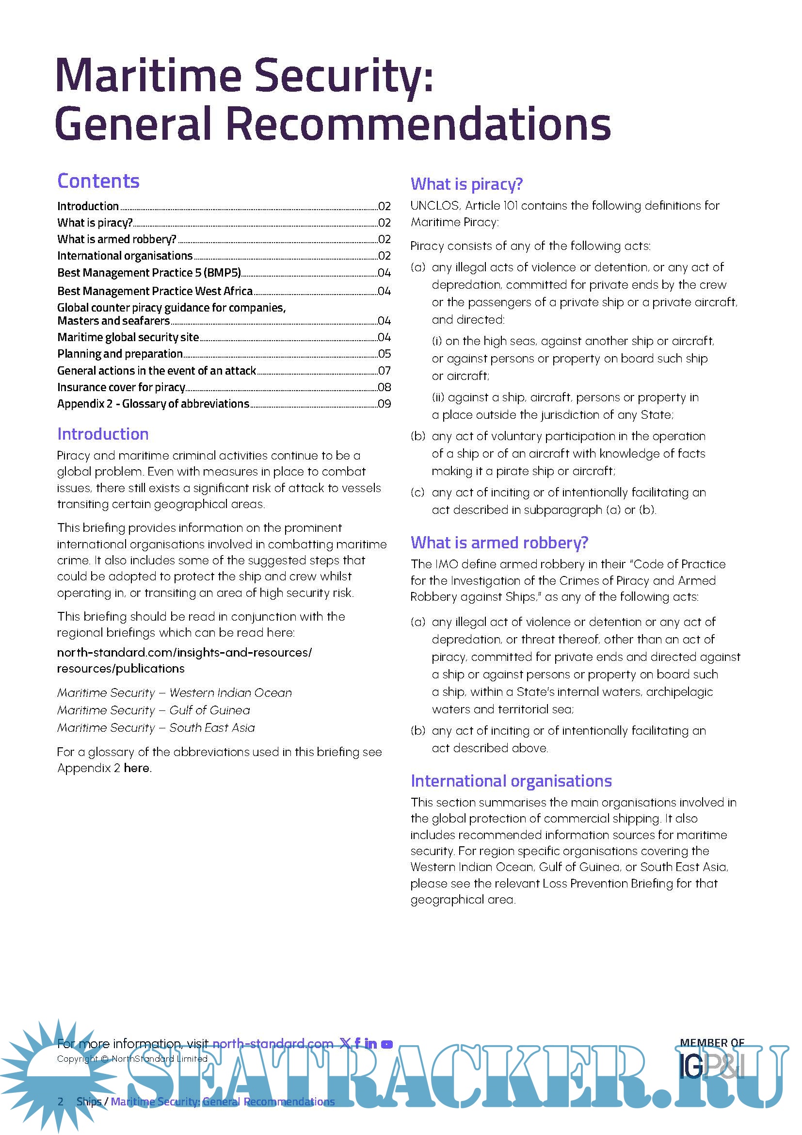Year: 2024 Language: English Author: NorthStandard Genre: Reference book Edition: 9 Aug 2024 Format: PDF Quality: eBook Pages count: 10 Description: This briefing provides information on the prominent international organisations involved in combatting maritime crime. It also includes some of the suggested steps that could be adopted to protect the ship and crew whilst operating in, or transiting an area of high security risk.