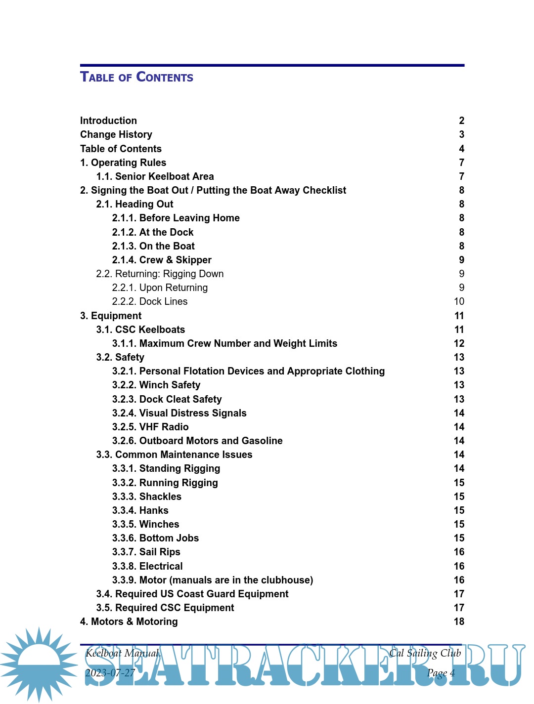 Year: 2023 Language: English Author: Burchik S. at all Genre: Manual Publisher: Cal Sailing Club Format: PDF Quality: eBook Pages count: 61 Description: So you’ve been messing about in dinghies for a while and have your Junior rating and you feel it’s time to start sailing on the keelboats. This is intended to be a guide to get you started, and also as a reference as you go through the CSC keelboat lesson series or when geęing private instruction. The material covered in this manual will continue to build on the basics learned in dinghies, with aęention called to some of the big differences between the two. A keelboat is slower to respond, has a greater turning radius and, with a large mass, momentum will be a big factor in how the boat behaves. The fundamentals are not going to be covered here, as they are thoroughly discussed in Colgate and other basic sailing books listed at the end of this manual. The most important skills to be learned are: recognizing what the boat will be doing before it happens and planning maneuvers before executing them. Having a thorough understanding of basic sail mechanics will also be a good starting point for learning to sail keelboats.