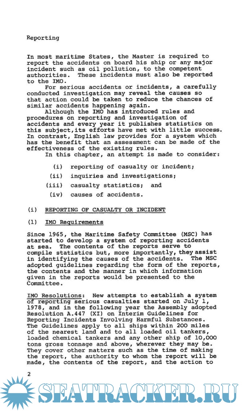 1.Reporting, Investigation, Statistics and Causes of Accidents i) Reporting of Casualty or Incident ii) Inquiries and Investigations iii) Casualty Statistics iv) Causes of Accidents 2. Collision as a Major Cause of Accidents i) The Collision Rules ii) Civil Liability iii) Criminal Liability 3. Other Causes of Navigational Accidents i) Vessel Traffic Services (VTS) ii) Accidents Caused by Defective Charts iii) Accidents with Wrecks 4. Salvage and Towage i) The Law of Salvage ii) The Law of Towage 5. General Average i) General Average Act ii) Outline of the Rules iii) Adjustment of General Average 6. Personal Injury i) Seafarers and Other Persons on Board The Ship ii) Passengers 7. Pollution i) Oil ii) Noxious Liquid Substances