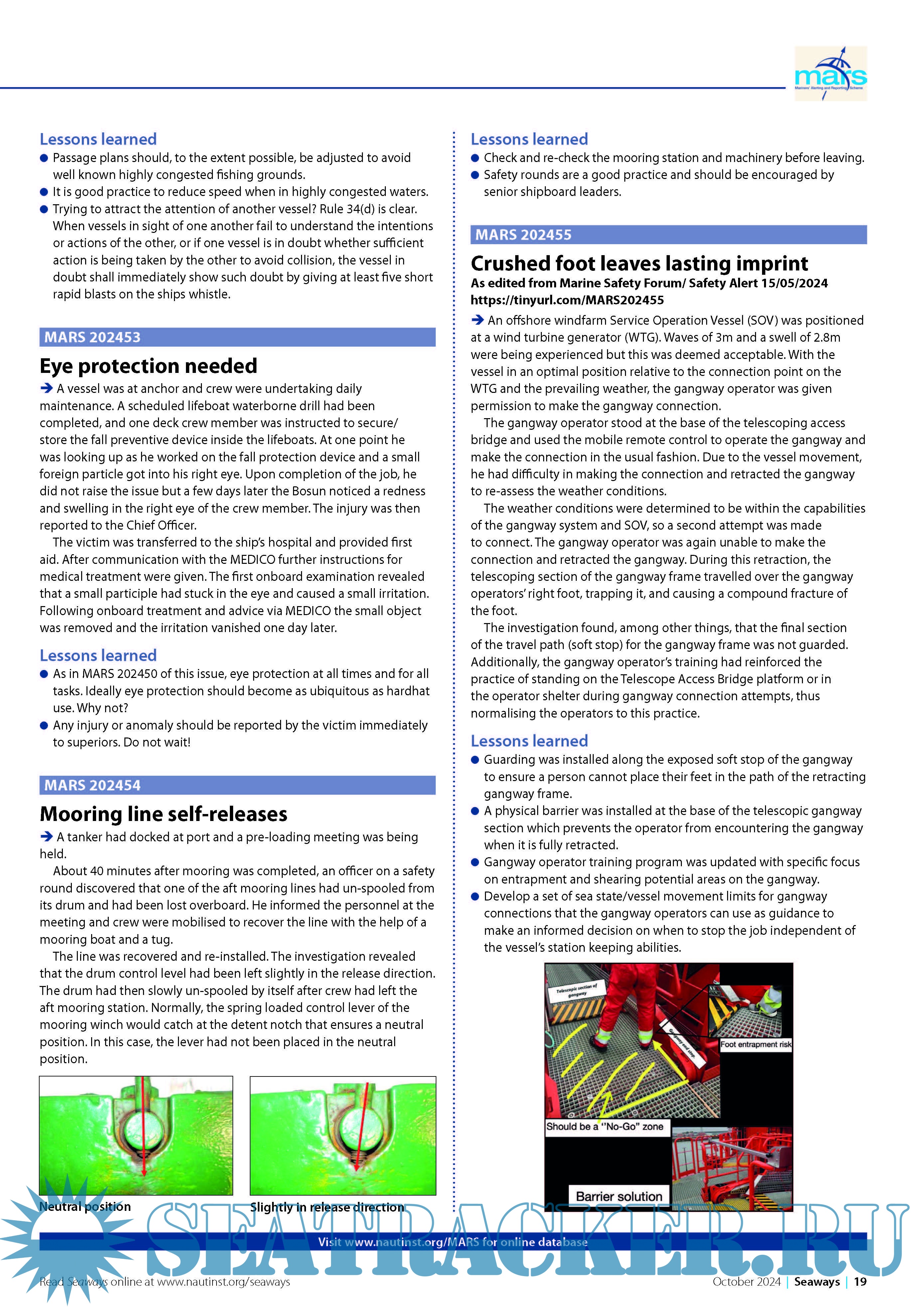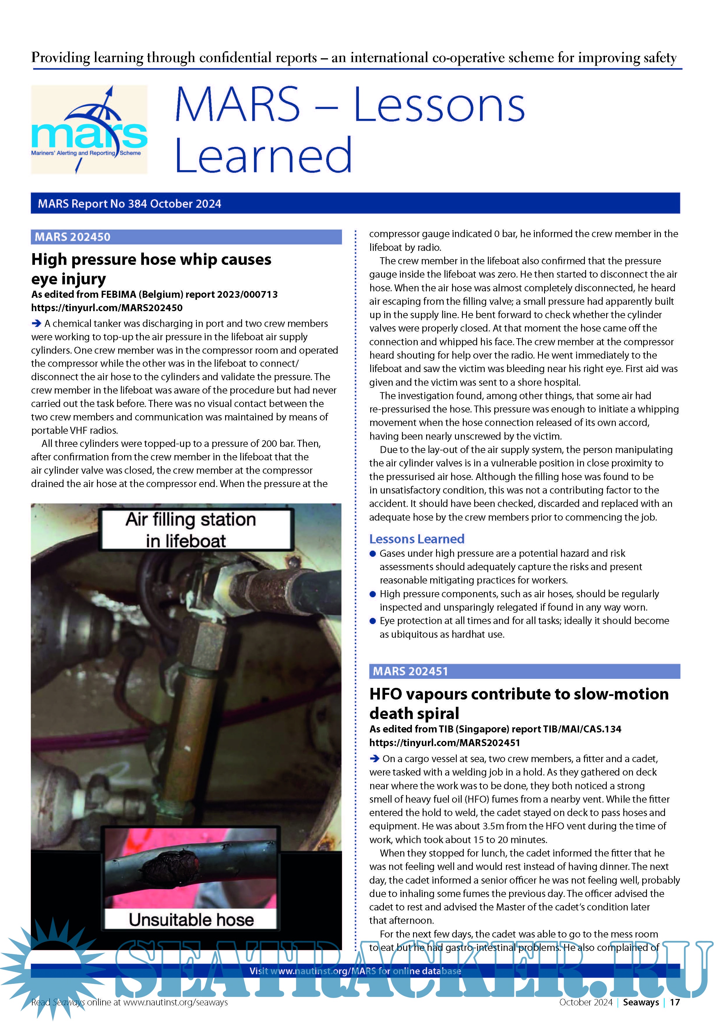 Year: 2024 Language: English Author: The Nautical Institute Genre: Periodical publication Publisher: The Nautical Institute Edition: issue No.384 October, 2024 Format: PDF Quality: eBook Pages count: 4 Description: Providing learning through confidential reports an international co-operative scheme for improving safety. MARS is a searchable database containing reports of accidents and near misses stretching back over a quarter of a century. Funded through the generous support of the Institute's Nautical Affiliate partners, it is one of the maritime industry's leading risk reduction initiatives and is helping to make life safer for seafarers everywhere.