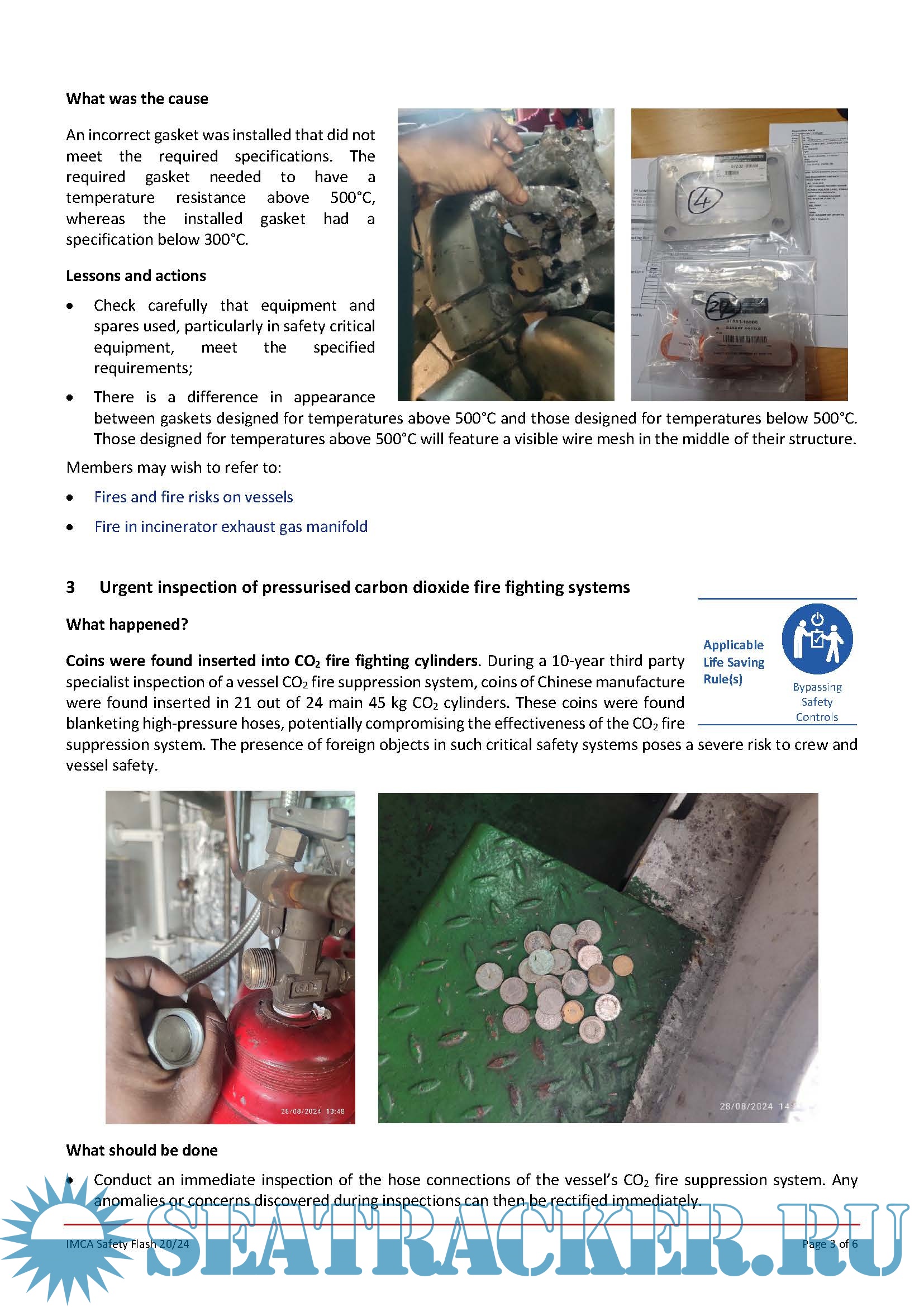 IMCA SF 20/24 - Fire in engine room - Near Miss: Smoke and fire on Main Engine Exhaust - Urgent inspection of pressurised carbon dioxide fire fighting systems - MSF: Safety pins left in fire suppression system – high potential near miss - Inappropriate automatic activation of fixed fire-fighting system - NTSB: Fire on vessel – escaped exhaust gases