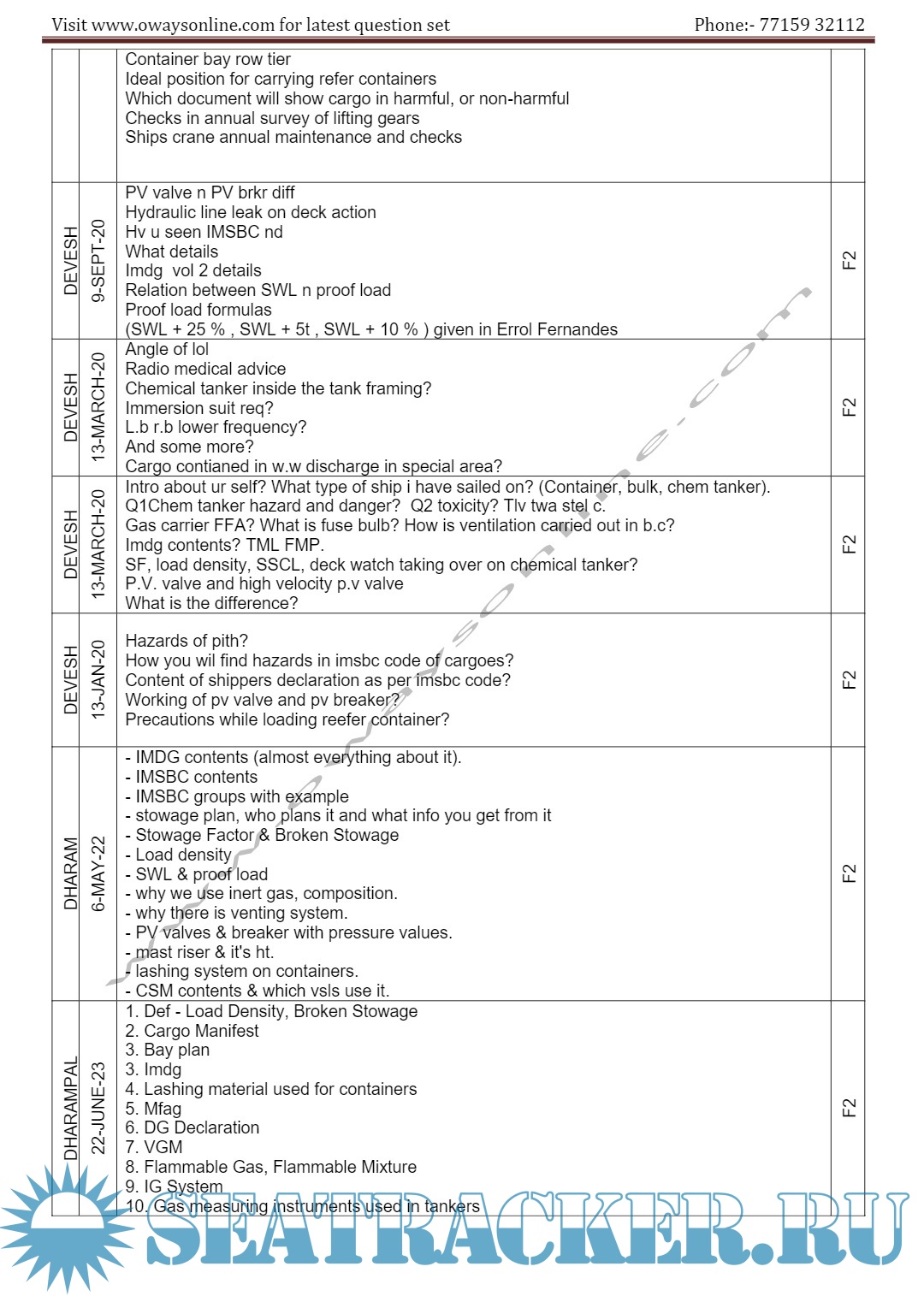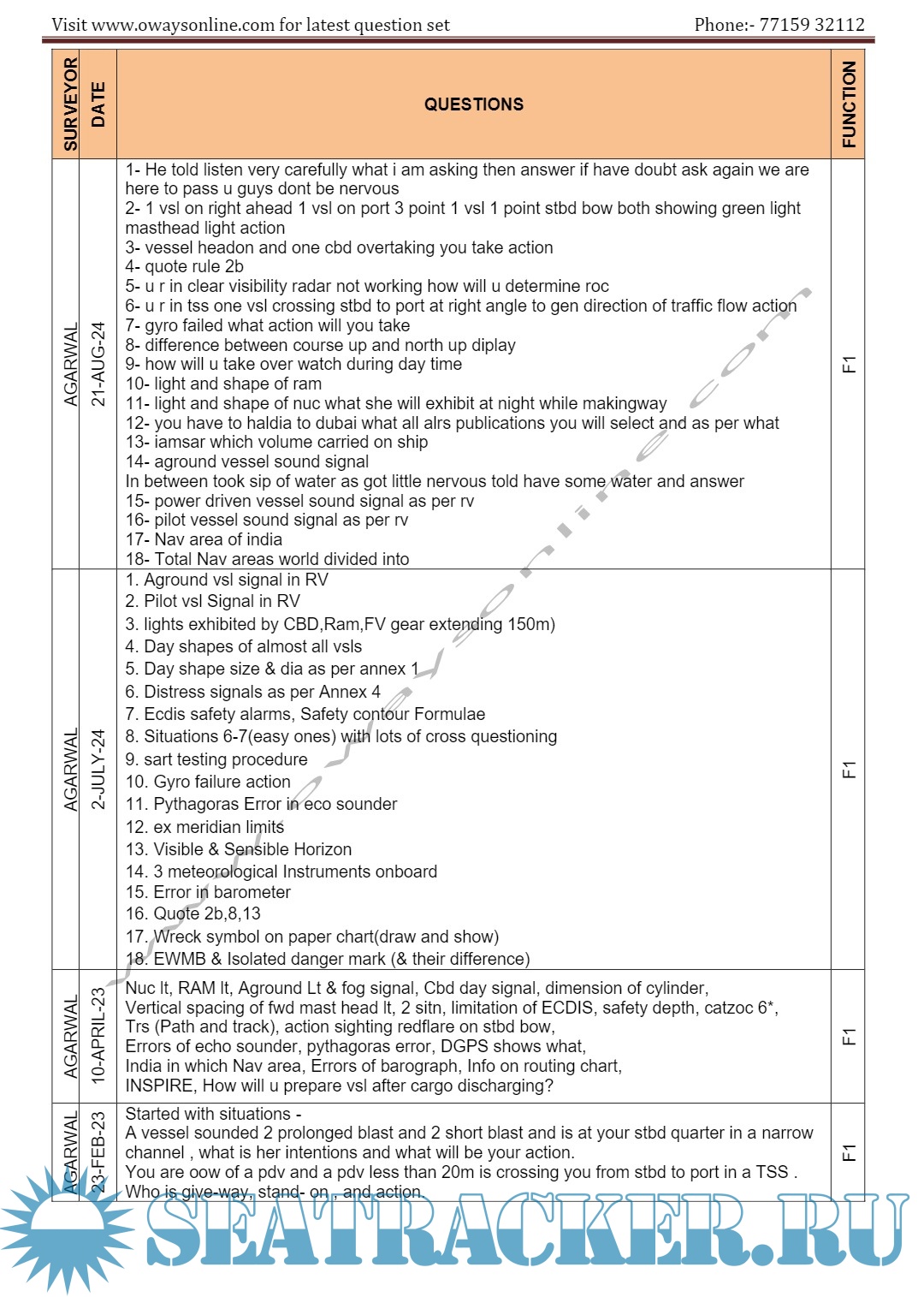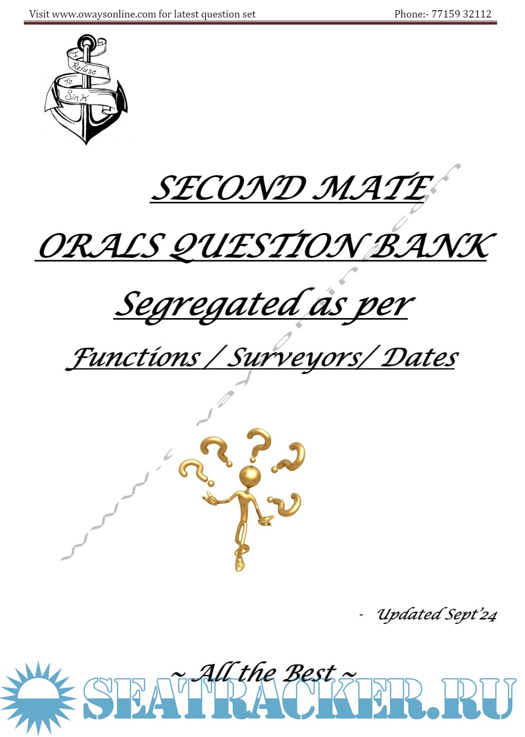 Year: 2024 Language: English Author: Oways Online Format: PDF Quality: eBook Pages count: 230 Description: Please Note:- ➢ These question are segregated as follows:- 1st Segregation By Function 2nd Segragation by Name of Surveyor & 3rd Segregation by Dates in Descending order. ➢ You might find some questions quite old, as those surveyors still comes in MMD/ D.G. However they are taking orals of other candidates and not Second Mates. However, if the surveyor of Second mates doesn’t come, they might take your orals.
