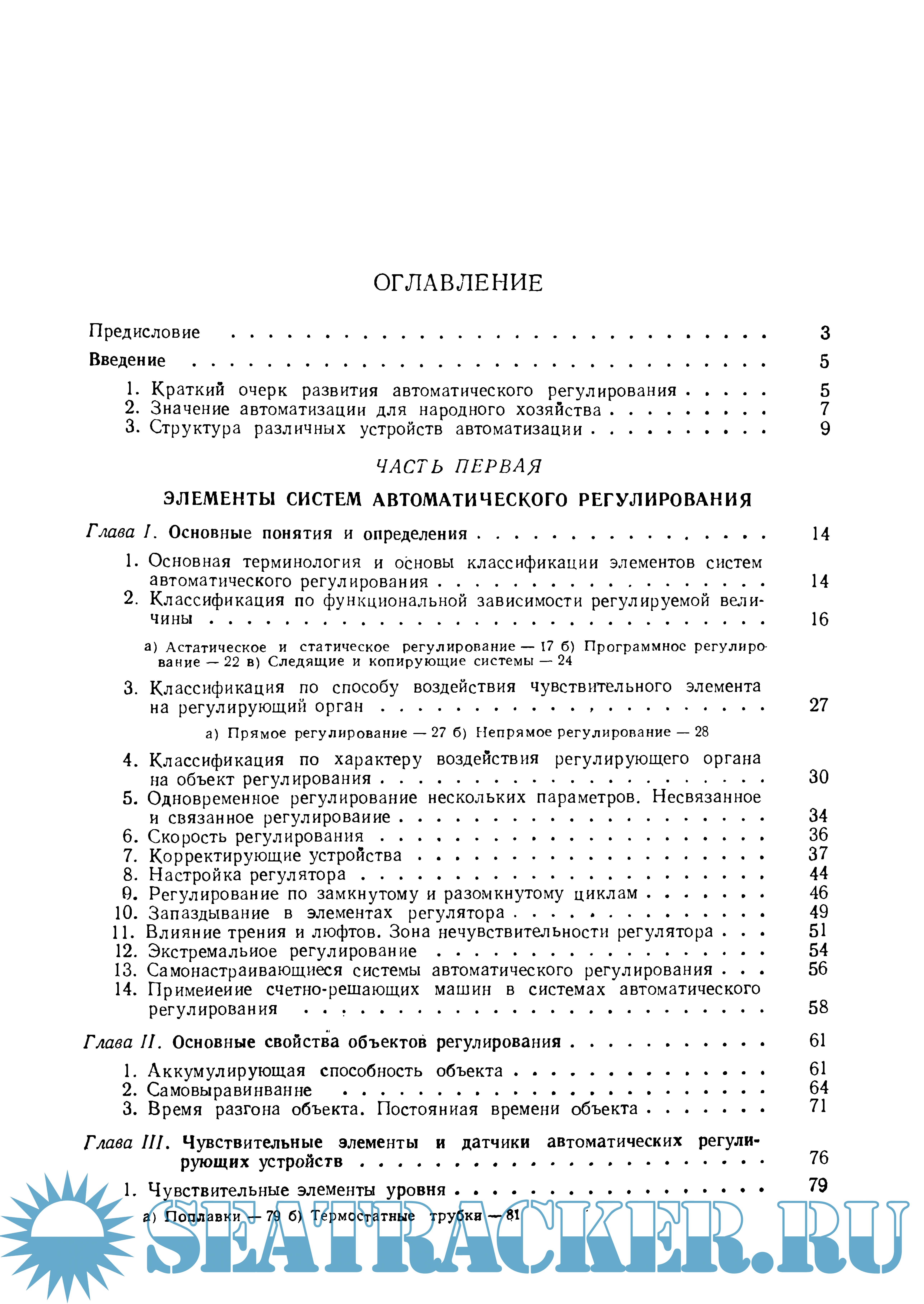Первая часть книги посвящена статике систем регулирования и описанию основных принципиальных схем и их элементов. Кроме того, рассмотрены вопросы терминологии и классификации систем автоматического регулирования и изложены особенности различных объектов регулирования.
