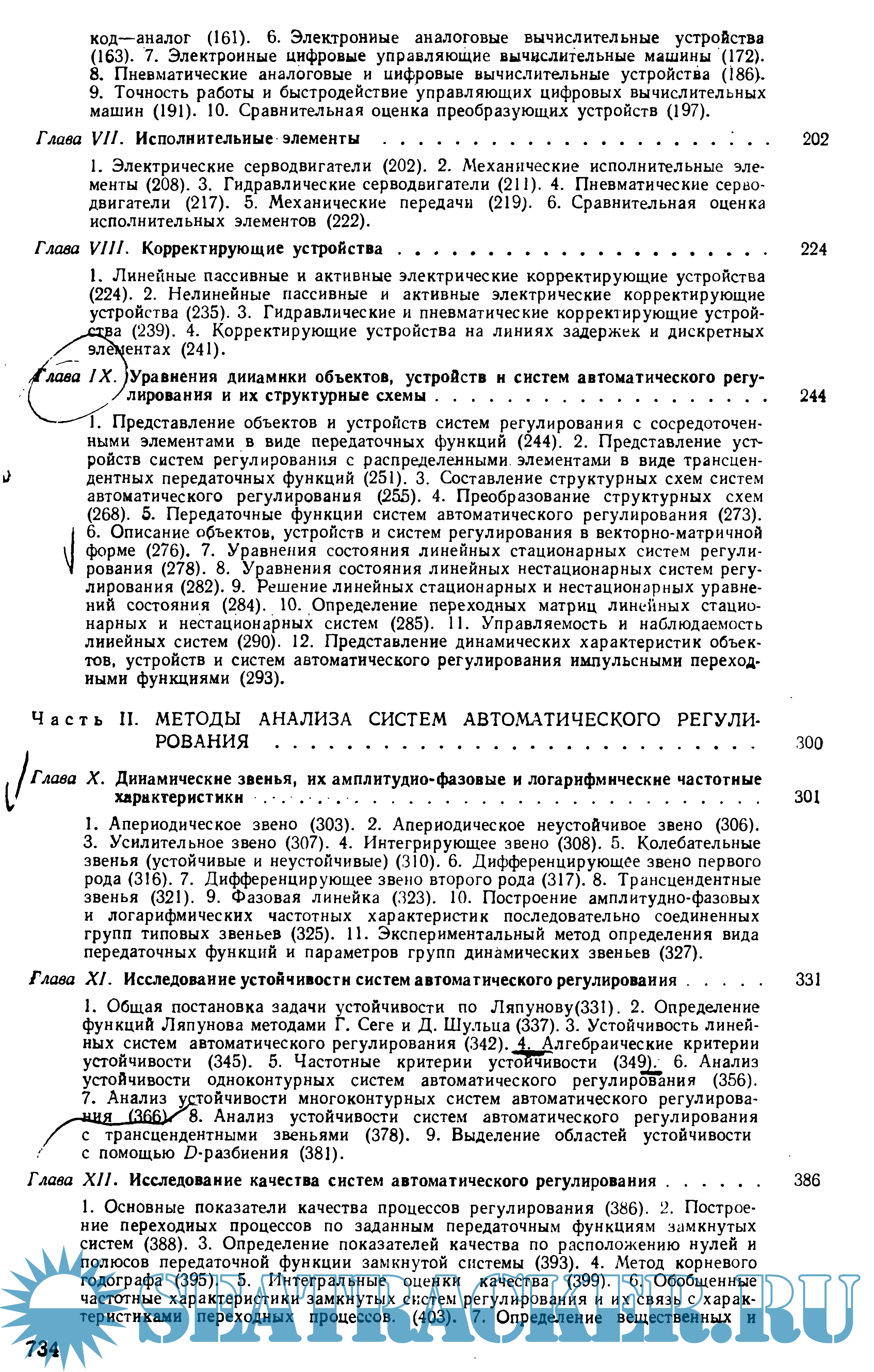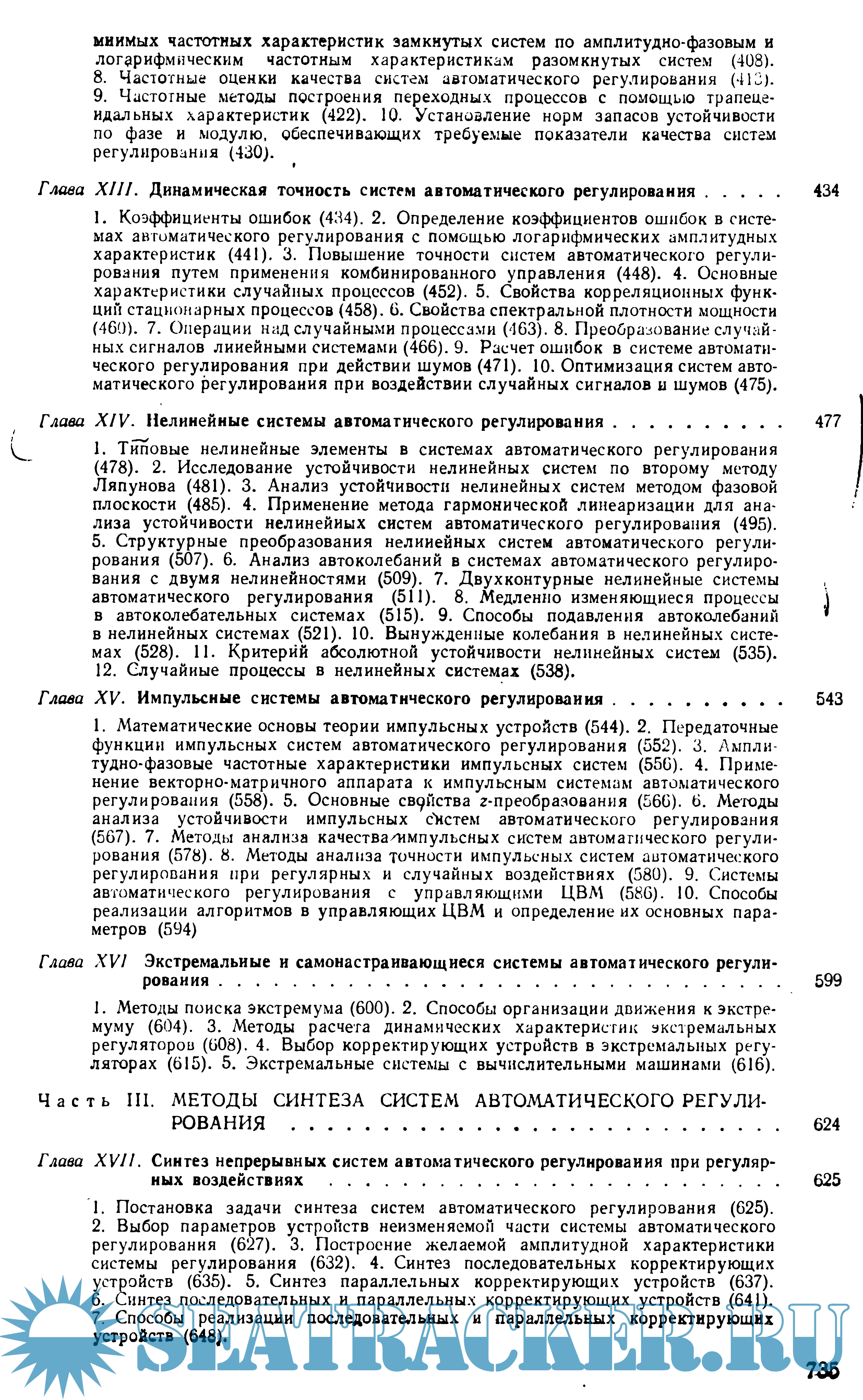 Во второй части рассматриваются методы анализа устойчивости, точности и качества динамических процессов в непрерывных, релейных, нелинейных, дискретных, дискретно-непрерывных, экстремальных и самонастраивающихся системах регулирования. Все эти методы иллюстрируются примерами расчета конкретных систем.