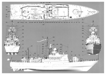 Описание: 28 листов цветных выкроек и инструкций для изготовления бумажной модели сторожевого корабля "АЛМАЗ" проекта 10410 в масштабе 1:200