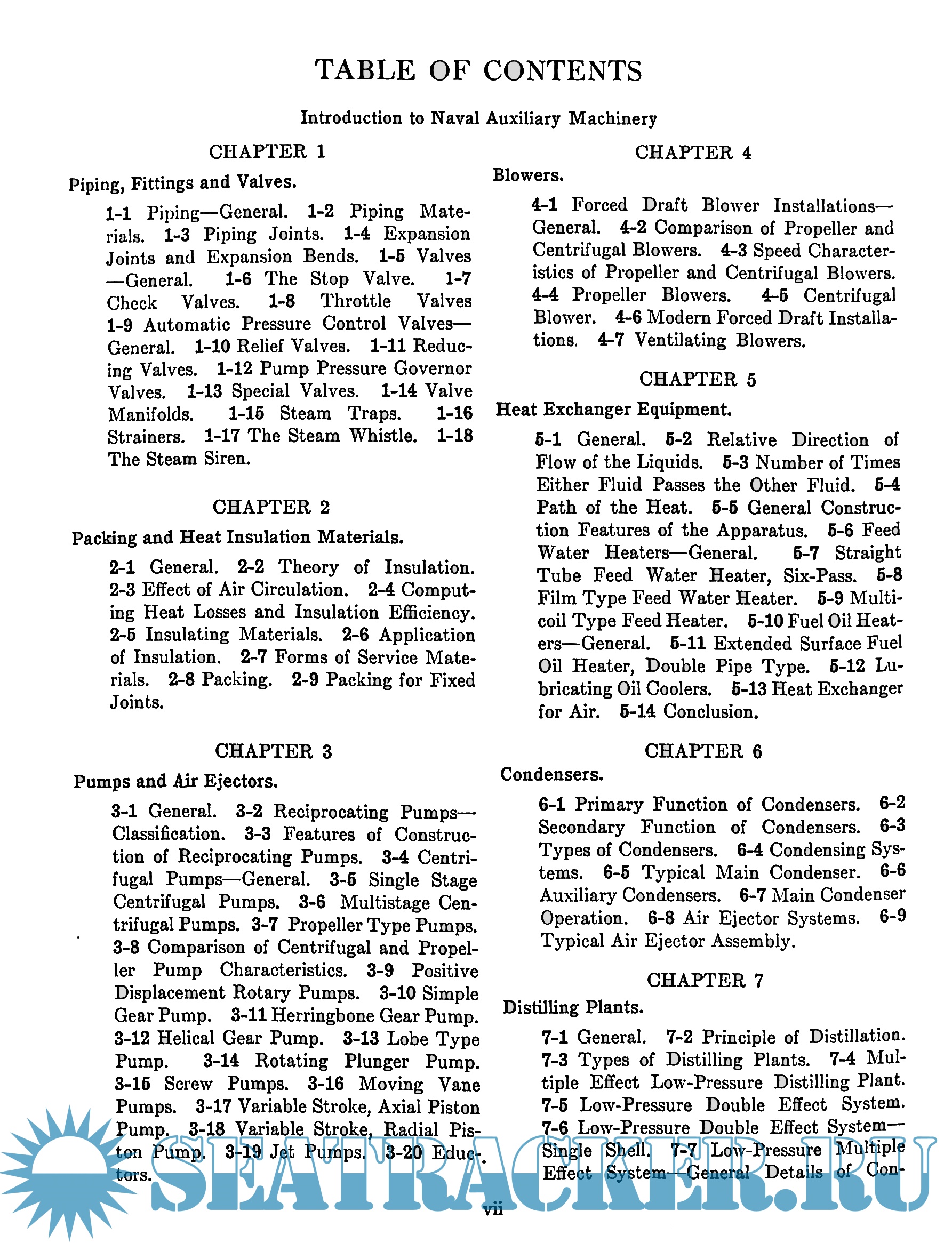 The subject matter has been presented in a descriptive manner to familiarize the student with the machinery he will encounter aboard ship, and to provide a background for the theoretical studies he will encounter in subsequent courses in fluid mechanics and thermodynamics.