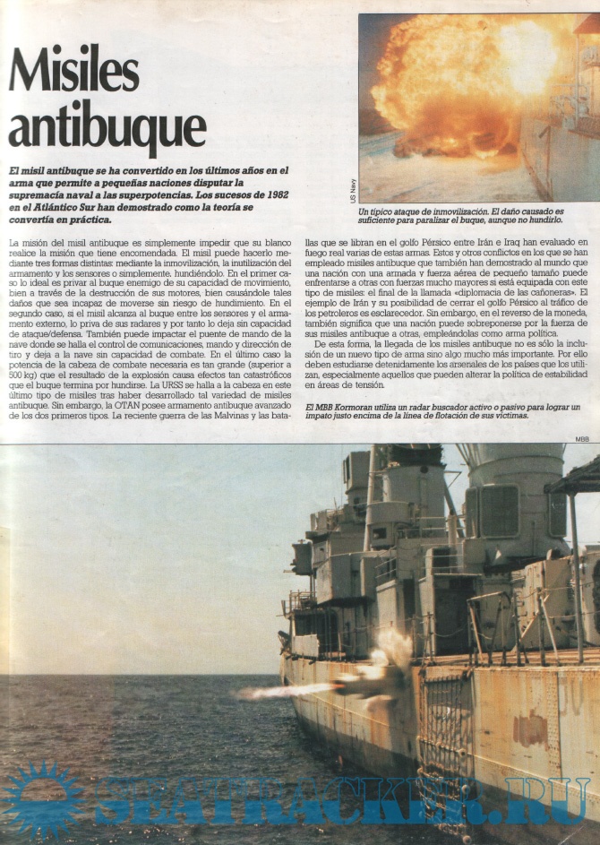 El misil antibuque se ha convertido en los ultimos años en el arma que permite a pequeñas naciones disputar la supremacia naval a las superpotencias. Los sucesos de 1982 en el Atlantico Sur han demostrado como la teoria se convertia en practica.