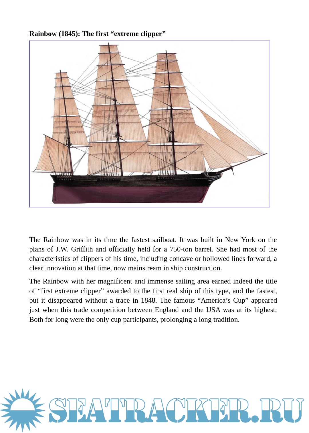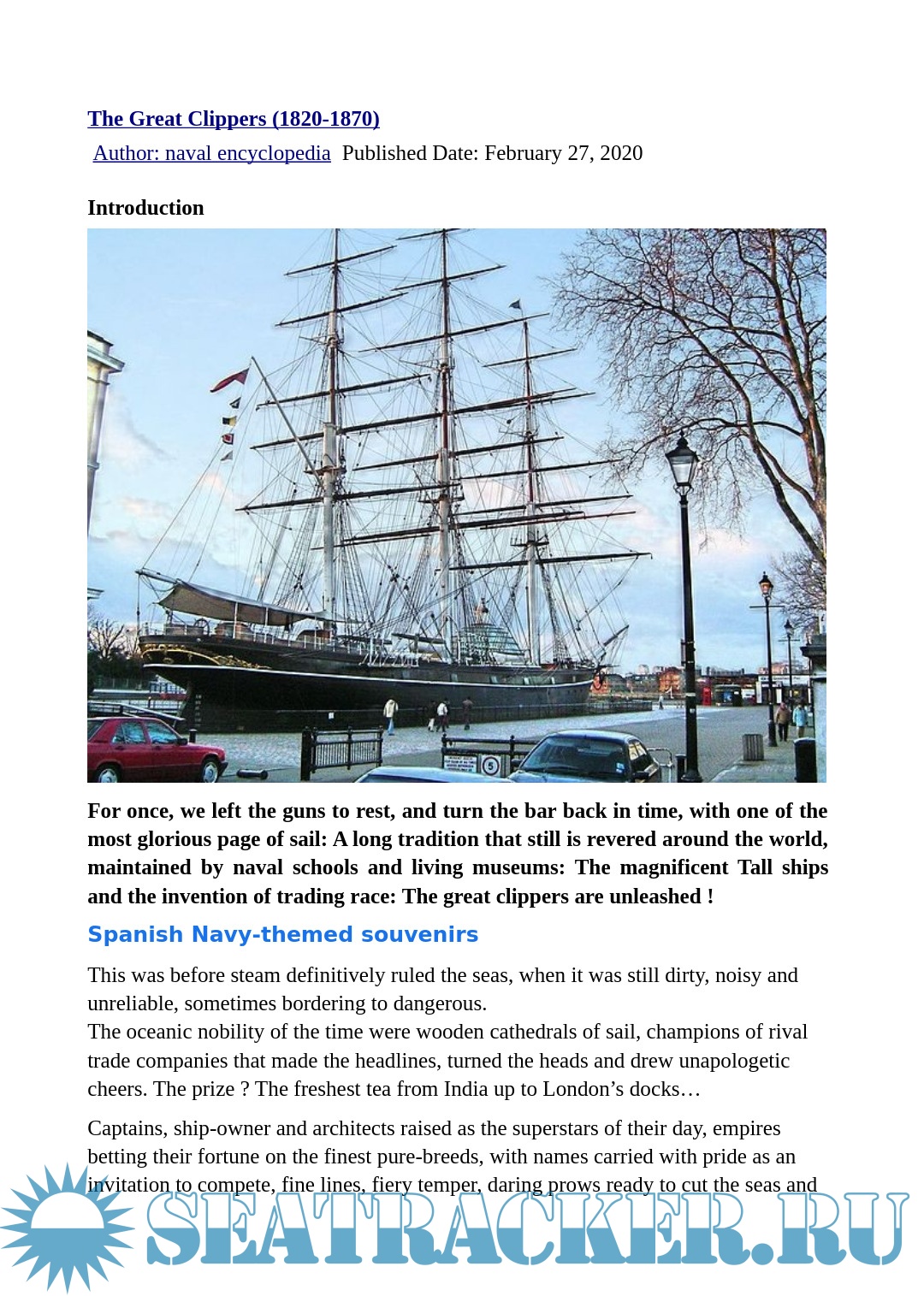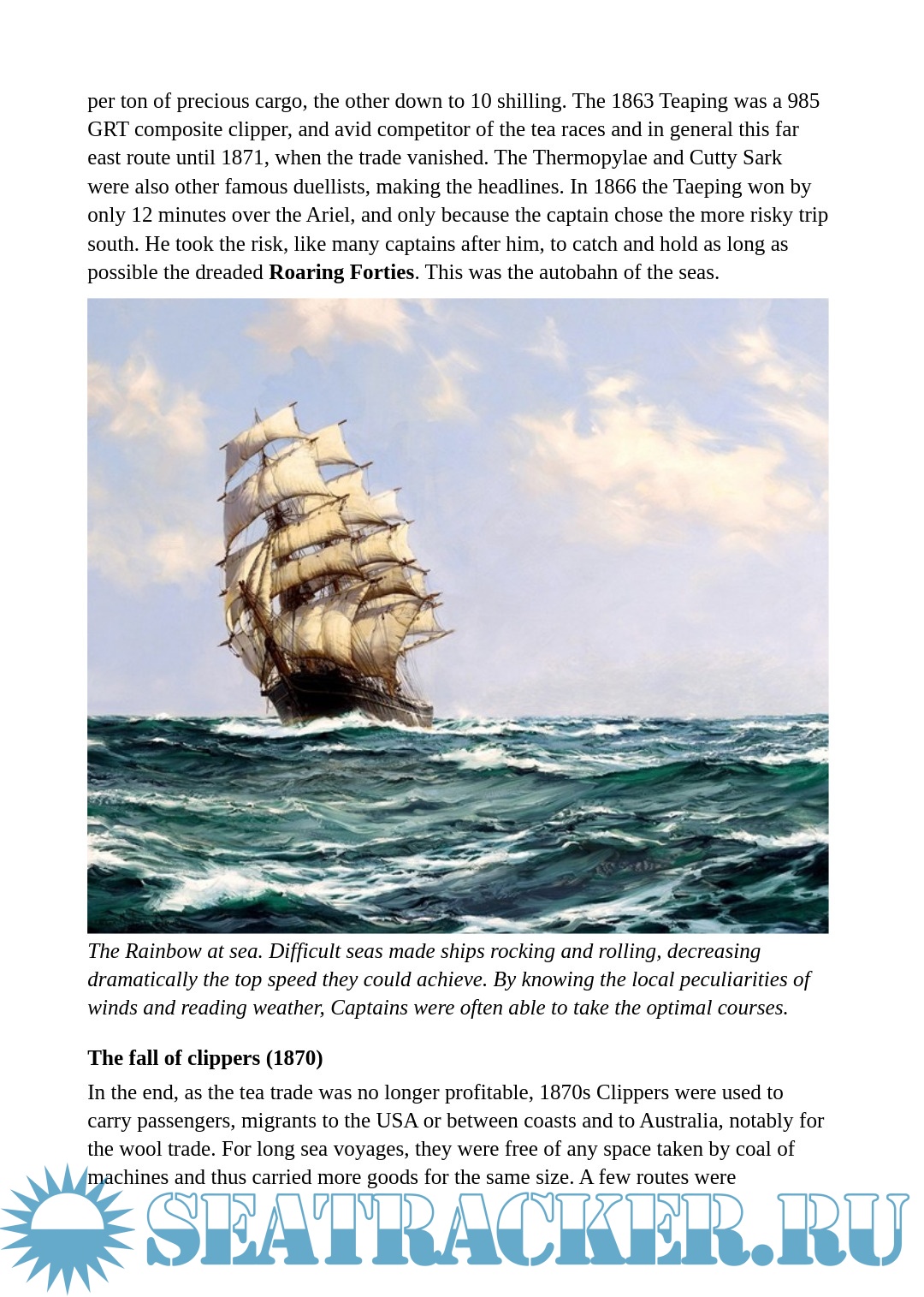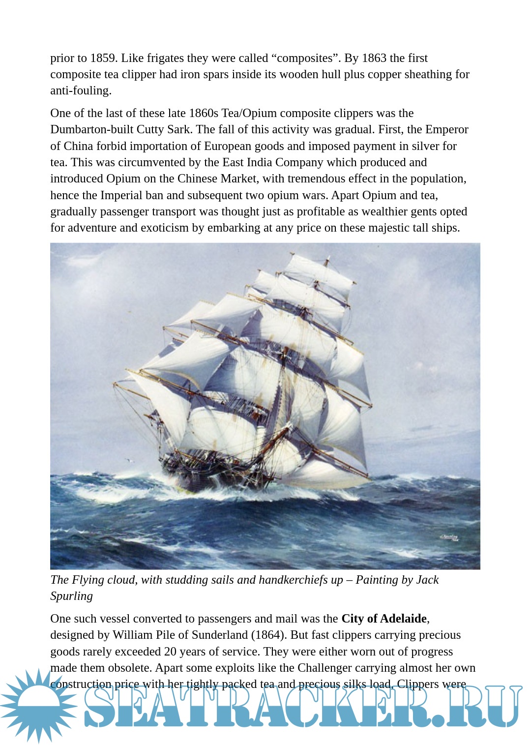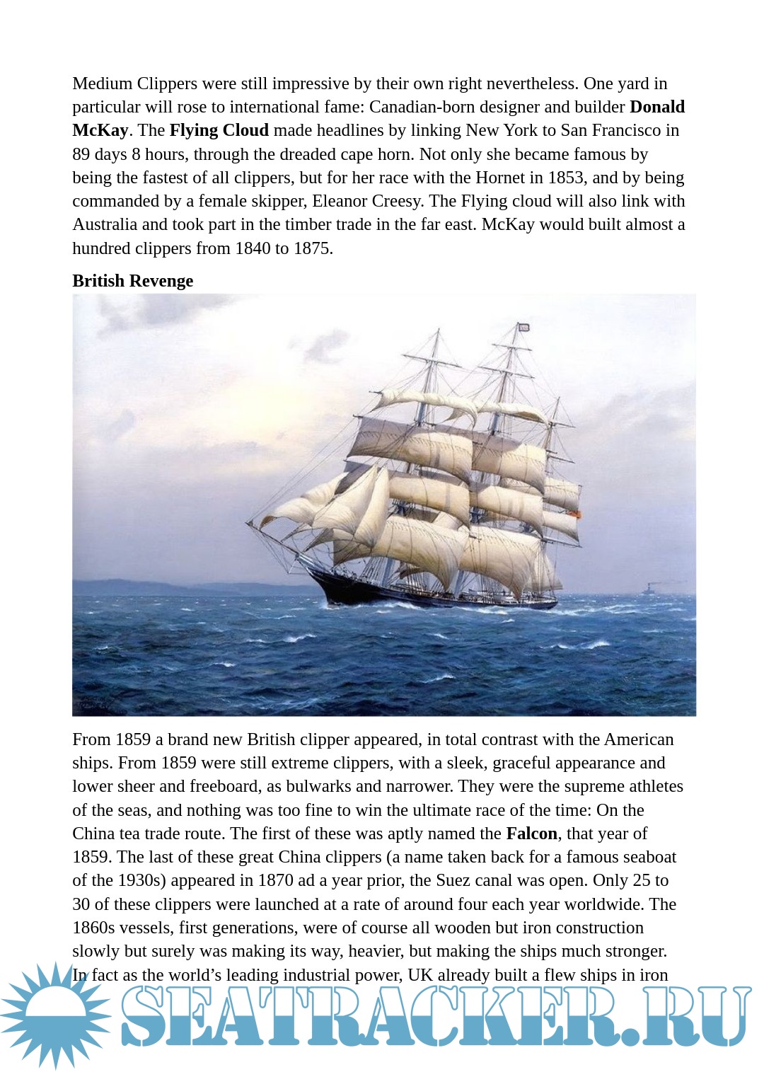 Year: 2020 Language: English Author: - Genre: Encyclopedia Format: PDF, DOCx Quality: eBook Pages count: 27 Description: The term itself was controversial. “Clipper” could either be likened to “to clip”, cut, cross quickly, or get close to an marine slang term for the “pinnacle” of its field, a thoroughbred of the seas as it was also associated with race horses. It was influenced by Dryden, the English poet that first used it to describe the swift flight of a falcon in the 17th century.