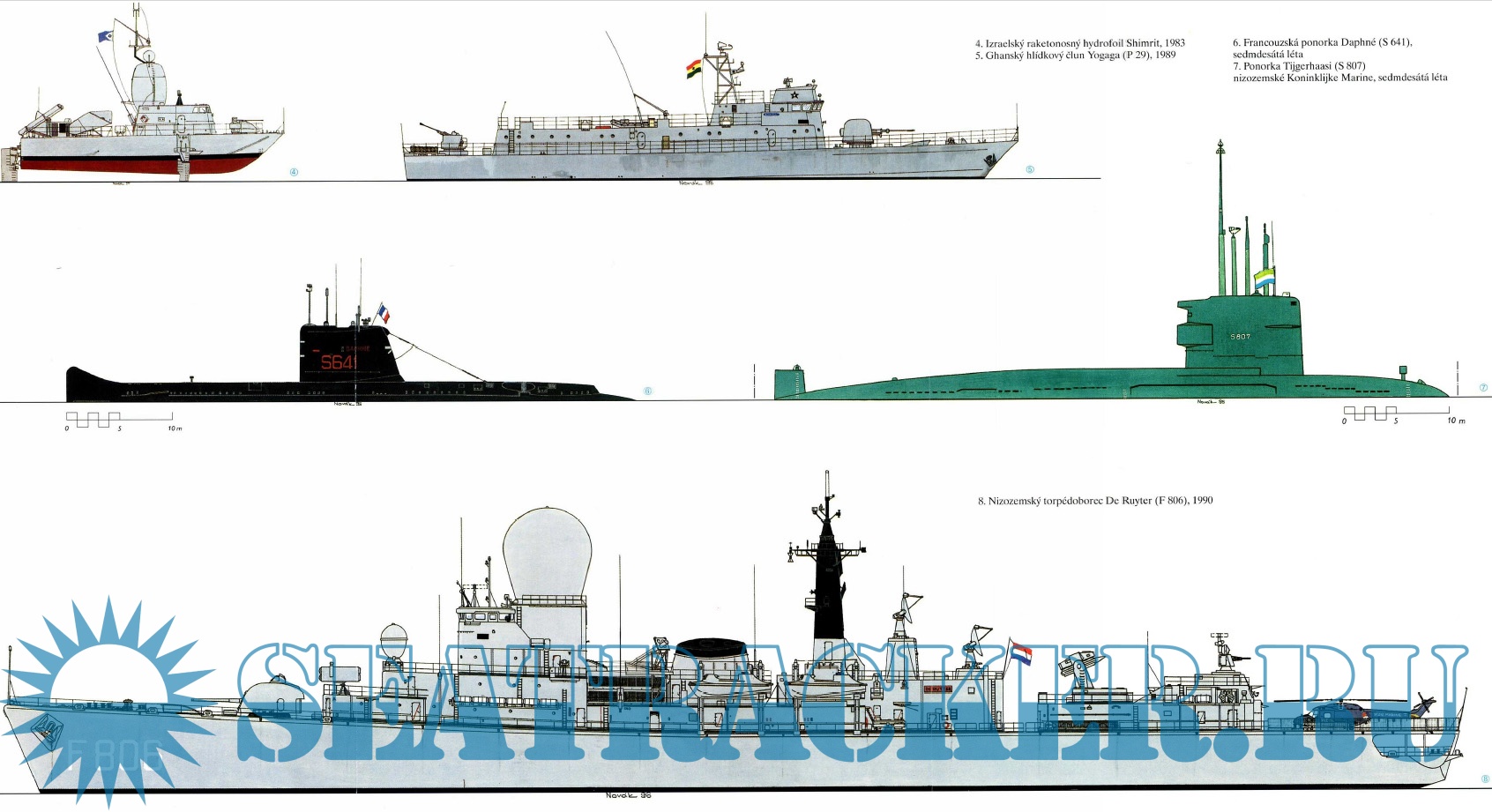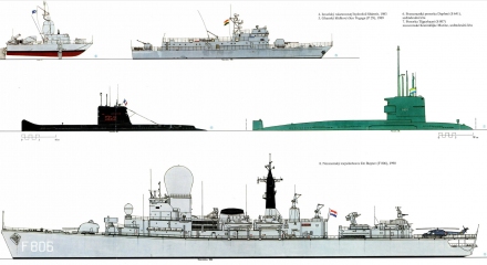 Z evropských zemí jsou to flotily Francie , Německa , Itálie ,Turecka , skandinávských a středomořských zemí a bývalých republik SSSR. kniha obsahuje 123 schémat, asi 20 barevných profilů a spoustu fotografií a technických informací. Mnoho schémat bojových člunů a různých pomocných lodí , které se v jiných příručkách nevyskytují.