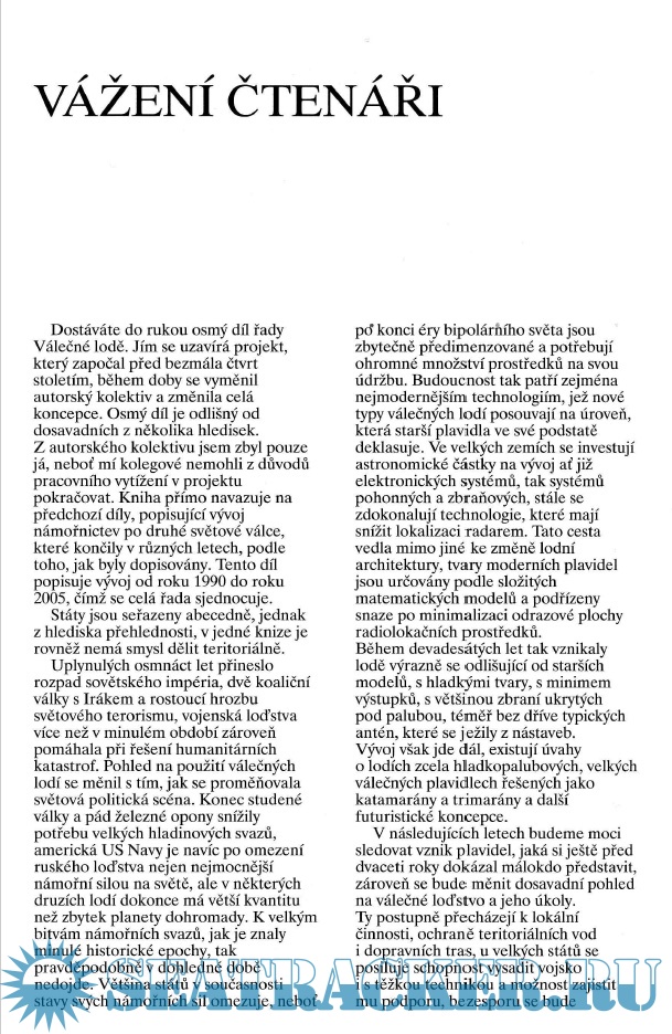 Year: 2008 Language: Czech Author: Pejcoch Ivo Genre: Historical Publisher: Nase Vojsko Format: PDF Quality: eBook Pages count: 528 Description: Valecne lode - Военные корабли - Чешский справочник по военно-морским силам всех времен и стран. Состоит из 8 томов. Osmý díl závěrečné série je věnován flotilám světa vstupujícím do 21.století. Nové technologie změnily konstrukci válečných lodí k nepoznání. Aerodynamická silueta, speciální kryty krytů a doplňky podle technologie stealth pro snížení viditelnosti pro radar. Stále masivnější aplikace při konstrukci lehkých slitin a kompozitních materiálů. Téměř úplná absence vnější výzbroje-většina raketových zbraní je ukryta uvnitř trupu v univerzálních vertikálních startovacích zařízeních s modulárními buňkami pro rakety různého typu. Zároveň se moderní lodě stávají tak drahými, že je nepravděpodobné, že bychom něco podobného viděli u obrovských řad torpédoborců a křižníků z poloviny dvacátého století. Stavění lodí je stále "kusé", jen malý počet zemí si může dovolit mít moderní flotilu. všichni ostatní musí používat lodě postavené na konci dvacátého století. Kniha obsahuje asi 100 schémat lodí a velký blok fotografií.