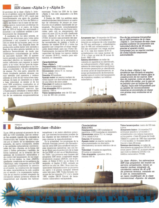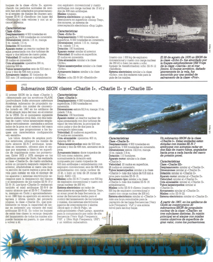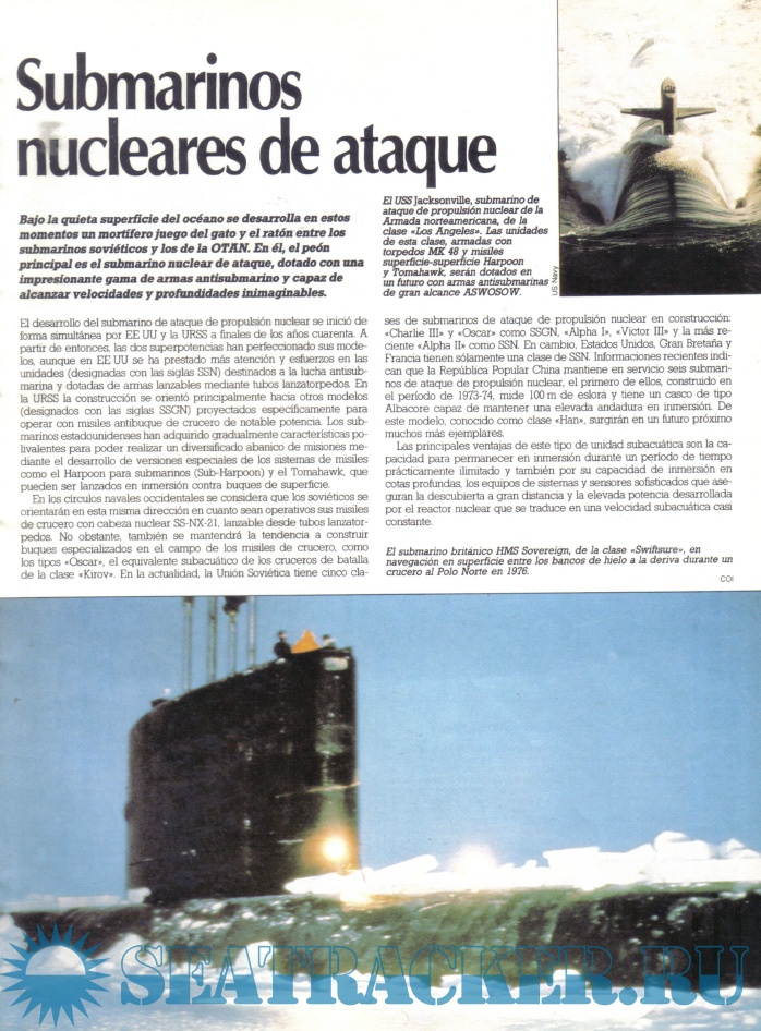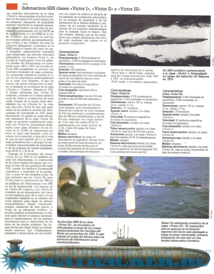 Year: 1984 Language: Spanish Author: Planeta-Agostini Genre: Historical Format: PDF Quality: Scanned pages Pages count: 23 Description: Enciclopedia de las Armas del Siglo XX. Esta obra de Planeta-Agostini consta de 120 fasciculos encuadernables en 10 volúmenes. En esta numero: Submarino nucleares de ataque. Bajo la quieta superficie del oceano se desarrolla en estos momentos un mortifero juego del gato y el raton entre los submarinos sovieticos y los de la OTAN. En el, el peon principal es el submarino nuclear de ataque, dotado con una impresionante gama de armas antisubmarinas y capaz de alcanzar velocidades y profundidades inimaginables.