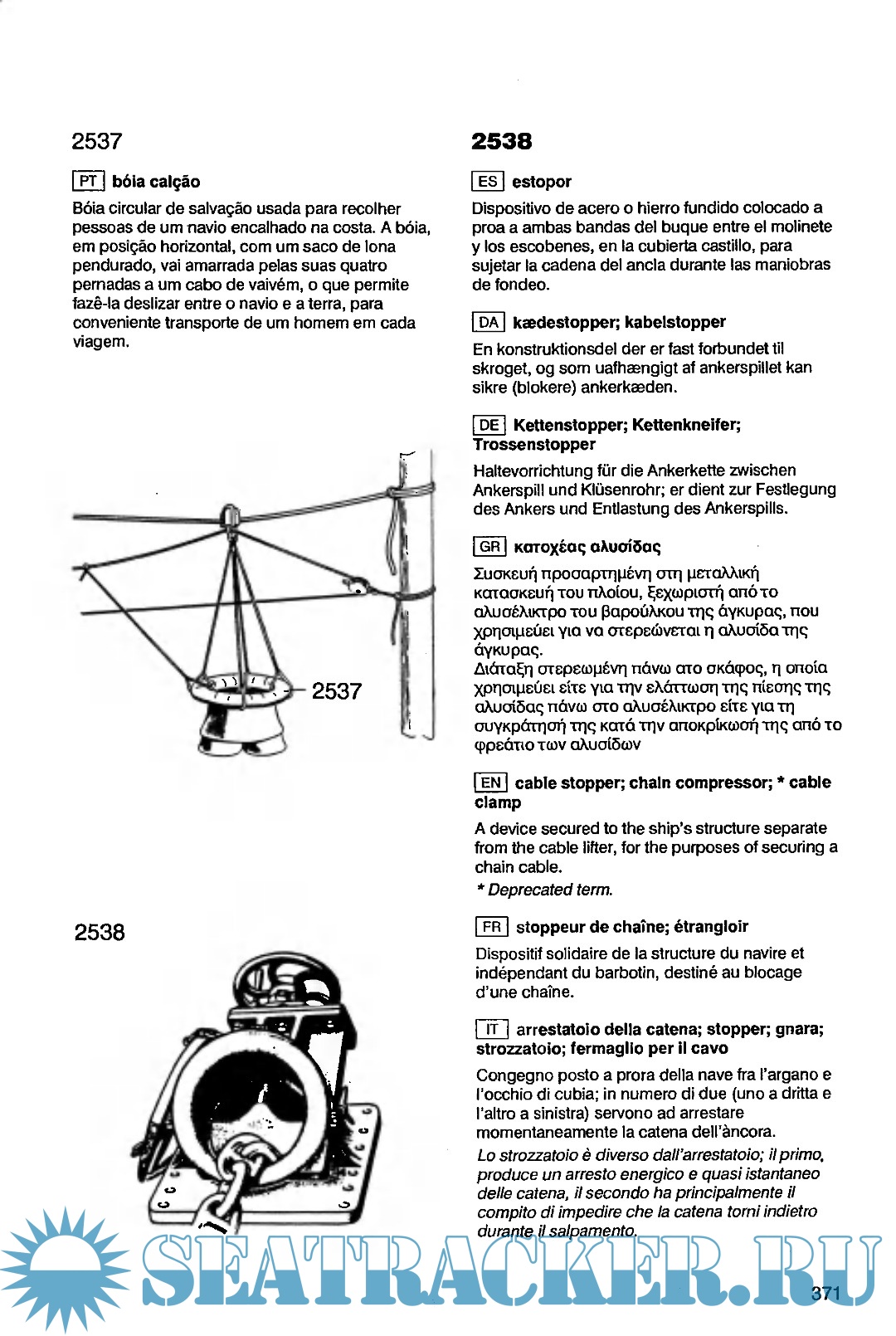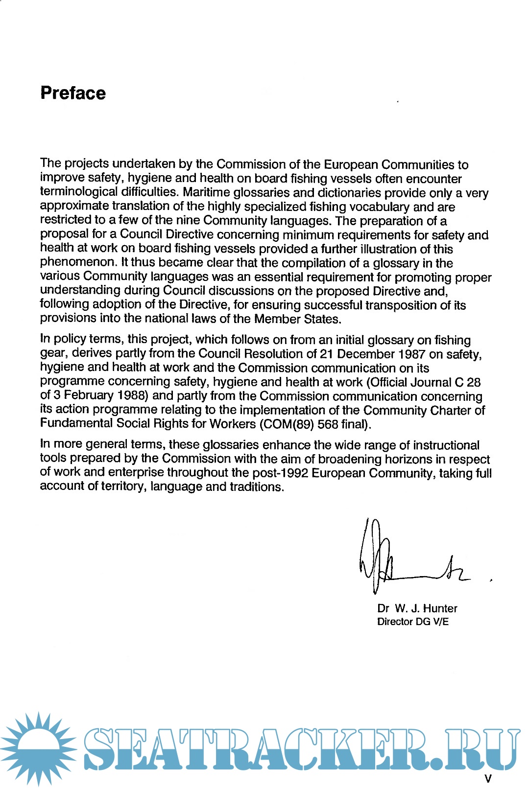 Year: 1993 Language: English, Danish, Dutch, French, German, Greek, Italian, Portuguese, Spanish Author: Commission of the European Communities Publisher: Blackwell Pub Edition: 2 ISBN: 0-85238-191-3, 92-825-9786-5 199 Format: PDF Quality: Scanned pages + text layer Pages count: 986 Description: Probably the most comprehensive dictionary of fishing vessel terminology ever written, this unique reference book for the fishing industry defines 1086 terms in nine languages - English, French, German, Italian, Spanish, Portugese, Danish, Greek and Dutch - accompanied wherever possible with appropriate illustrations. The number of entries has been doubled in this second edition. In addition to dealing with the many different types of fishing vessels, safety is dealt with in detail, including vessel parts and structures, installations on board, stability requirements, signals and life-saving equipment. Since fishing terminology is highly specialised and very difficult to find elsewhere a team of prominent international experts has been involved in compiling the work in order to guarantee maximum reliability.