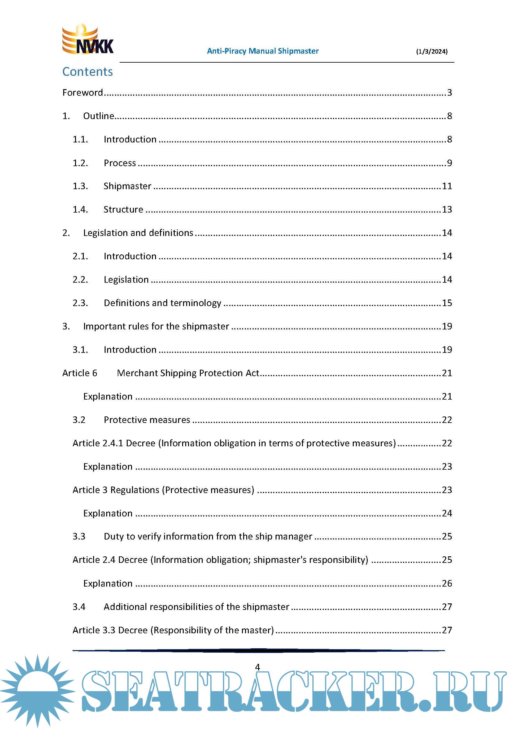 Year: 2024 Language: English Author: Peter van der Kruit Genre: Guide, Manual, Textbook Publisher: The Netherlands Shipmasters’ Association Edition: March, 2024 Format: PDF Quality: eBook Pages count: 71 Description: Anti-Piracy Manual for the Shipmaster of a ship flying the flag of the Netherlands. A practical, legal reference work for the Shipmaster to help protect his ship and those on board against pirates in the Gulf of Aden and along a section of the coast of East Africa, in the official Risk Area. This practical Manual, with a large number of uniquely numbered checklists, is intended for masters of ships sailing under the Dutch flag, who may encounter piracy during their voyage. From the preparation of the voyage to the final mandatory travel reports, the shipmaster are guided in their task. The core of this Manual is formed by a number of uniquely numbered checklists to make sure the shipmaster does not forget anything. Furthermore, a number of important subjects are discussed, such as the use of force, notifications and reports, fines, etc. This manual is primarily for the shipmaster, but it is also recommended to all other seafarers and interested parties, such as ship managers, trade unions, educational institutions and the government. Additional info: This Manual only applies to the Gulf of Aden and along a section of the coast of East Africa.