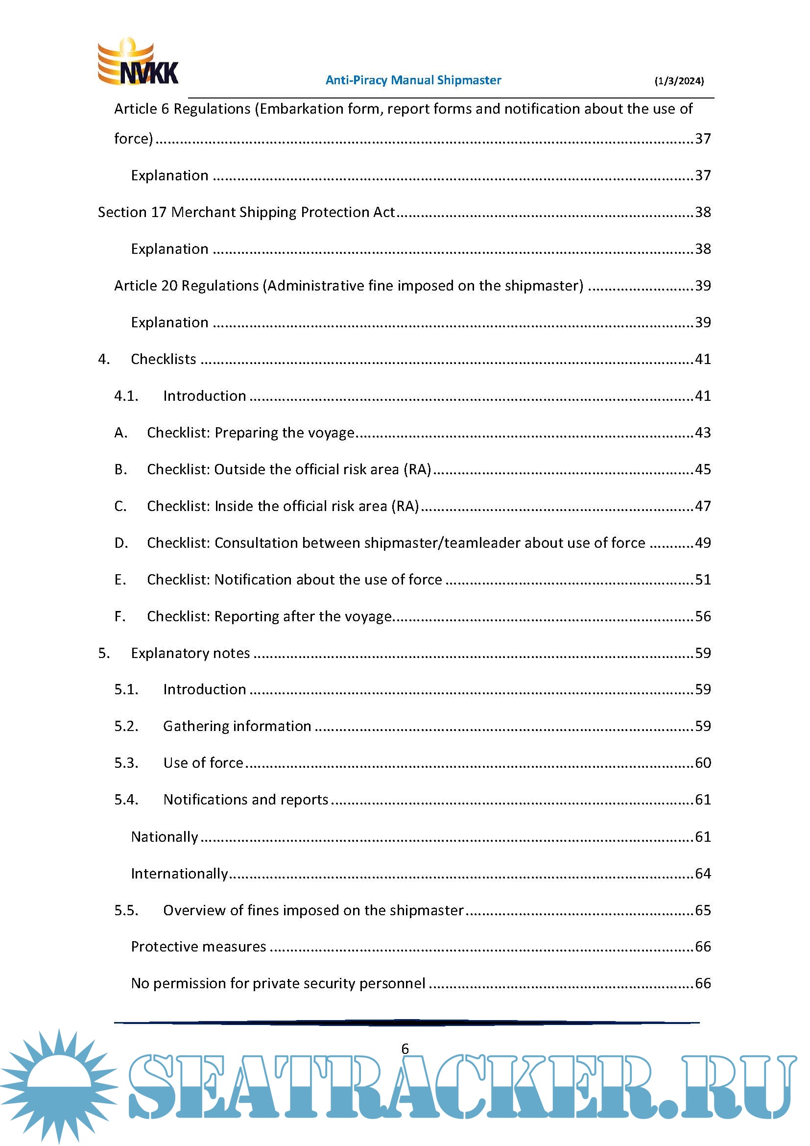 The core of this Manual is formed by a number of uniquely numbered checklists to make sure the shipmaster does not forget anything. Furthermore, a number of important subjects are discussed, such as the use of force, notifications and reports, fines, etc.