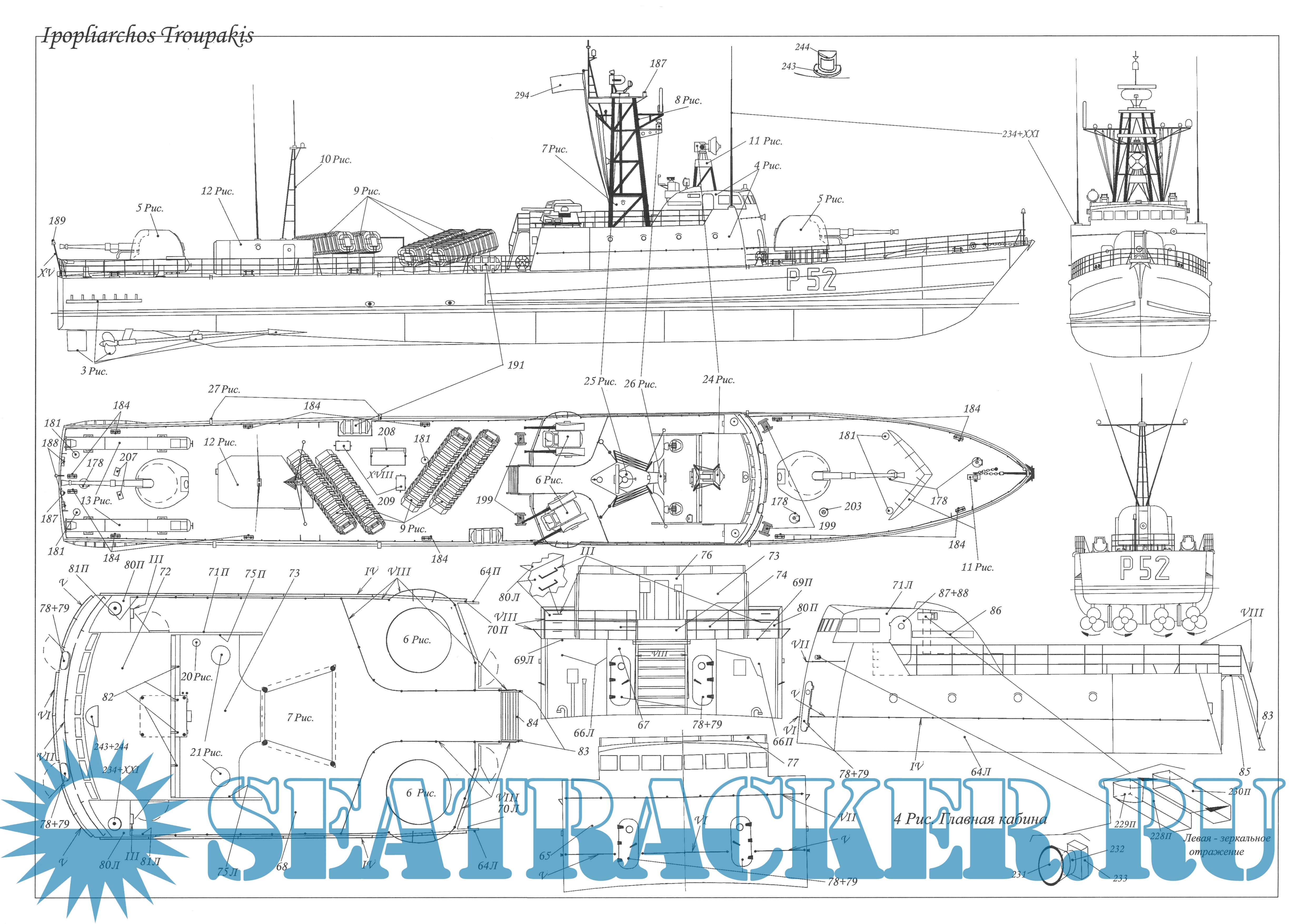 Описание: 21 лист цветных выкроек инструкций для изготовления бумажной модели большого ракетного корабля IPOPLIARHOS TROUPAKIS (Греция) в масштабе 1:100