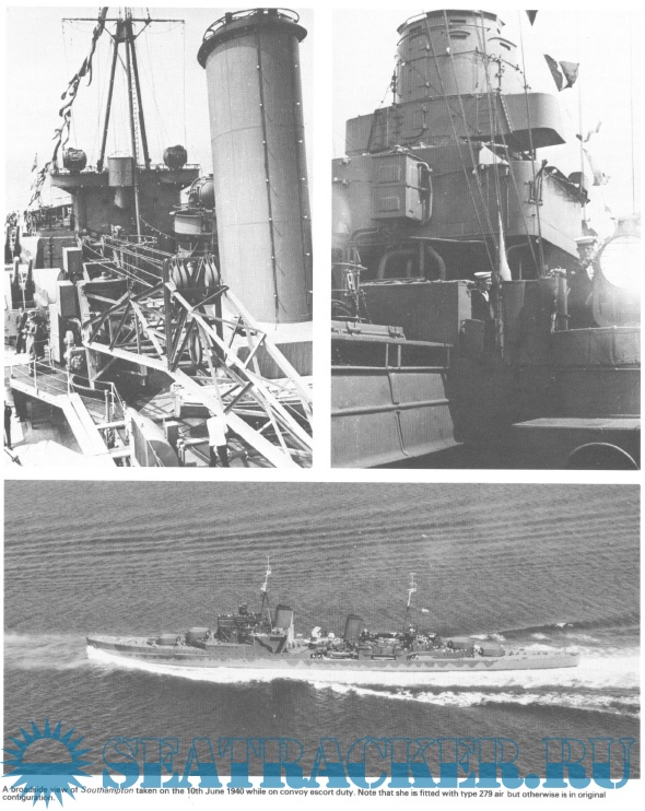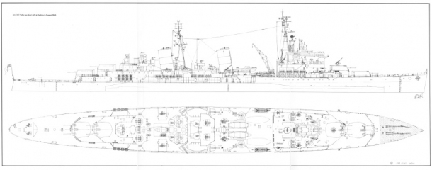 Description: The raison d’etre of the Southampton class cruisers (or Town class as they were later known) was very simple – a case of “keeping up with the neighbours”. Their design history however’ was quite complex, especially in the case of the later modified Town class. They were conceived in 1933 when it was learned that the Japanese were constructing the Mogami class cruisers. The only information available at that time was that these ships were to carry fifteen 6.1-inch guns, 5-inch thick side armour, and all on a standard displacement of 8,500 tons! The reaction to this news, both inside and outside of the Navy was immediate – a clamouring for the building of a matching class carrying a similar armament on the same displacement. Accordingly, the Admiralty asked the DNC about the possibility of producing a vessel.