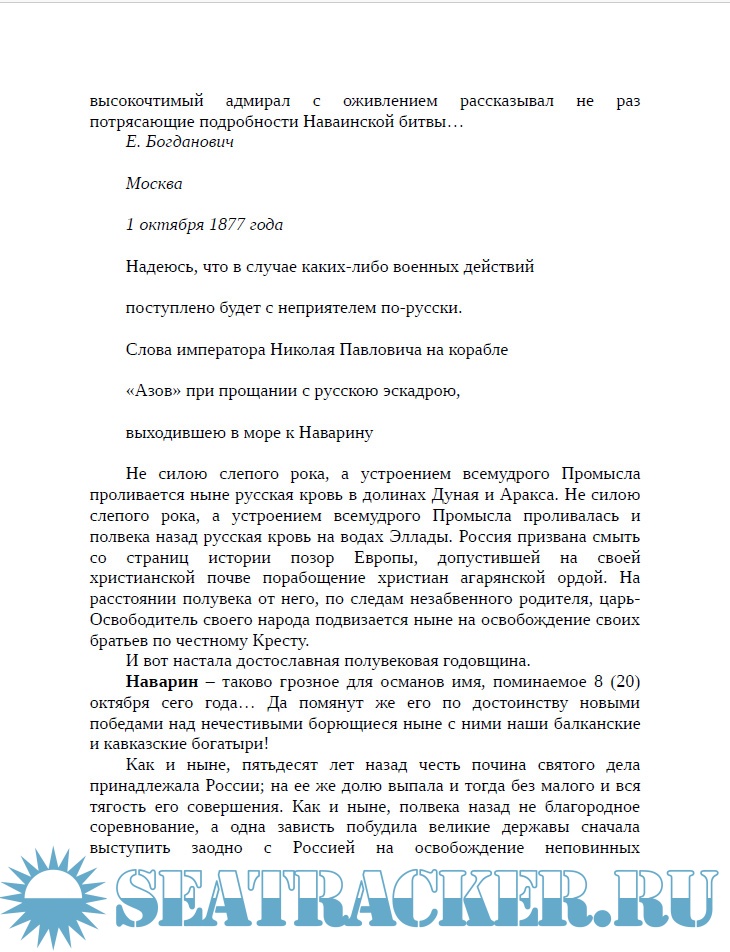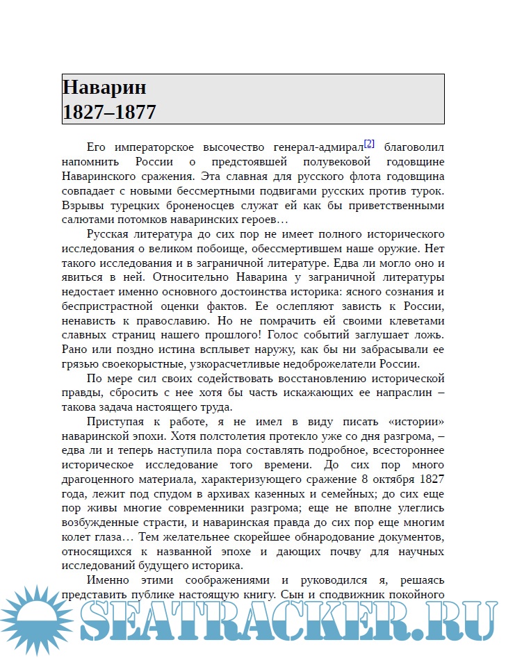 Год выпуска: 2019 Язык: Русский Автор: Богданович Е.В. Жанр: Историческое Издательство: ВЕЧЕ Формат: PDF Качество: Изначально компьютерное (eBook) Количество страниц: 478 Описание: В книге представлены две исторические работы генерала от инфантерии, писателя Евгения Васильевича Богдановича (1829-1914). Первая работа посвящена Наваринскому морскому сражению 1827 года между соединённой эскадрой России, Англии и Франции, с одной стороны, и турецко-египетским флотом - с другой. Разгром турецкого флота в этом сражении значительно ослабил морские силы Турции, что послужило важным вкладом в победу России в дальнейшей Русско-турецкой войне 1828-1829 годов. Второе исследование рассказывает о разгроме турецкой эскадры Черноморским флотом под командованием вице-адмирала Павла Степановича Нахимова 18 (30) ноября 1853 года в гавани города Синоп на черноморском побережье Турции. В историографии русского флота работы Е.В. Богдановича по праву считаются классическими.